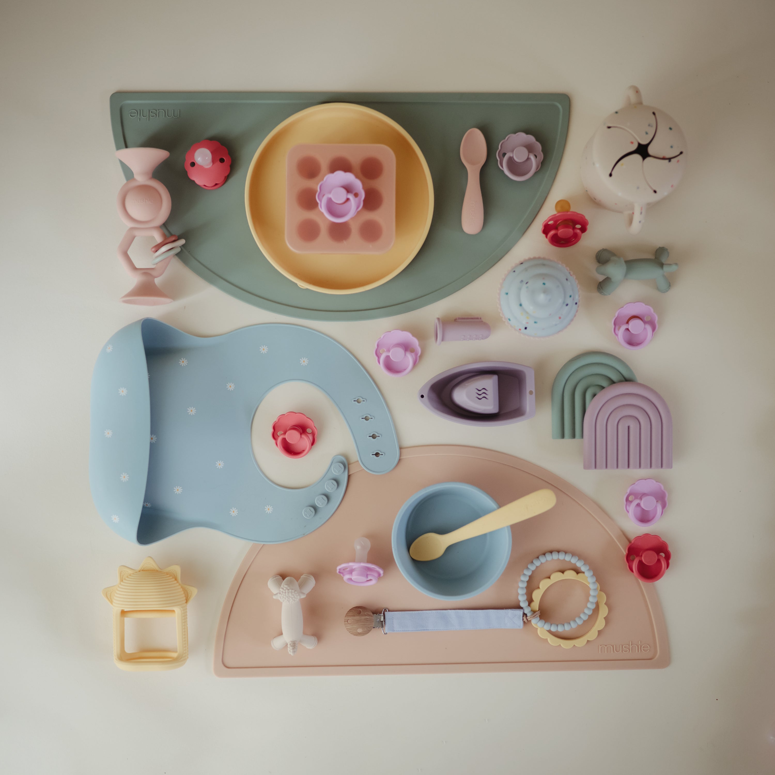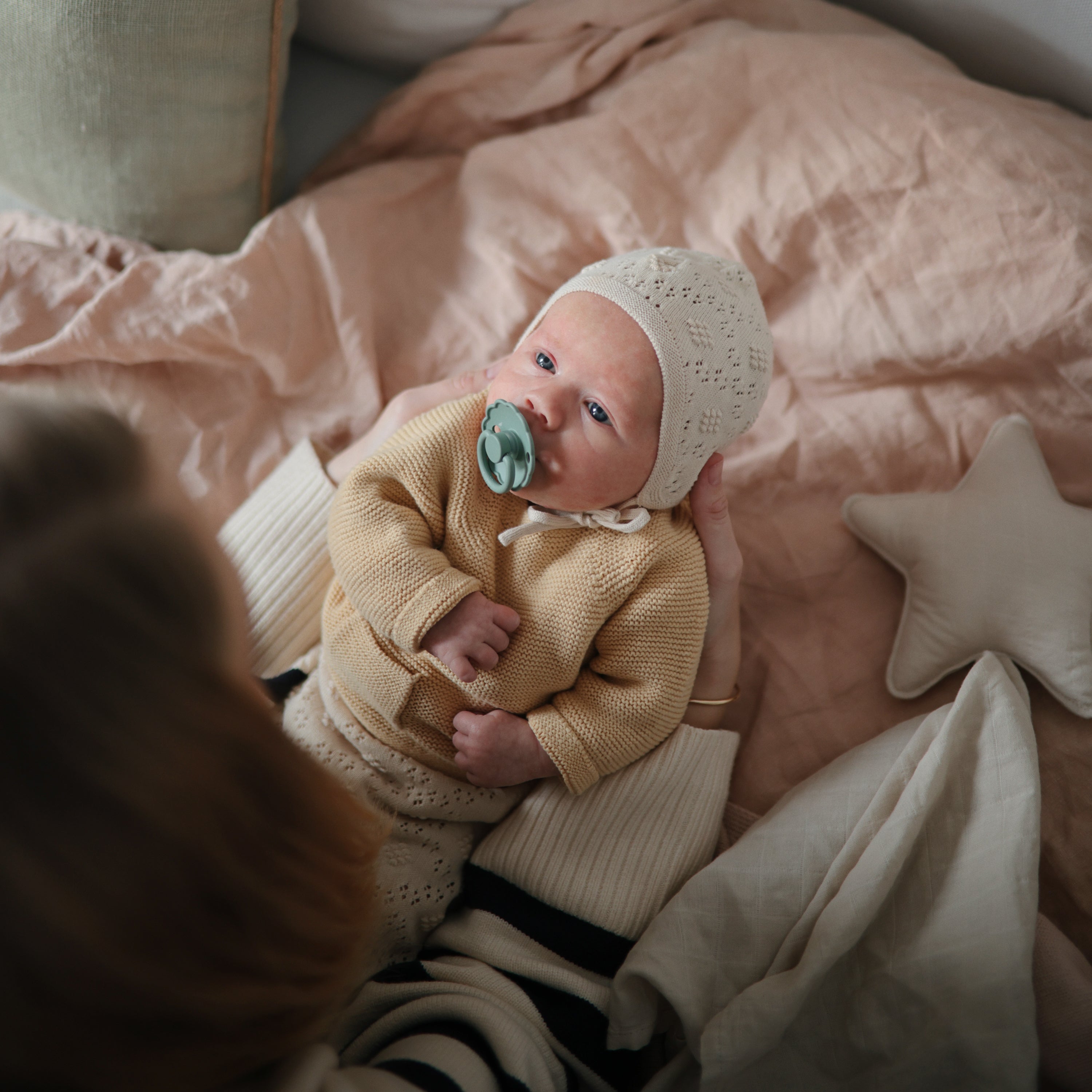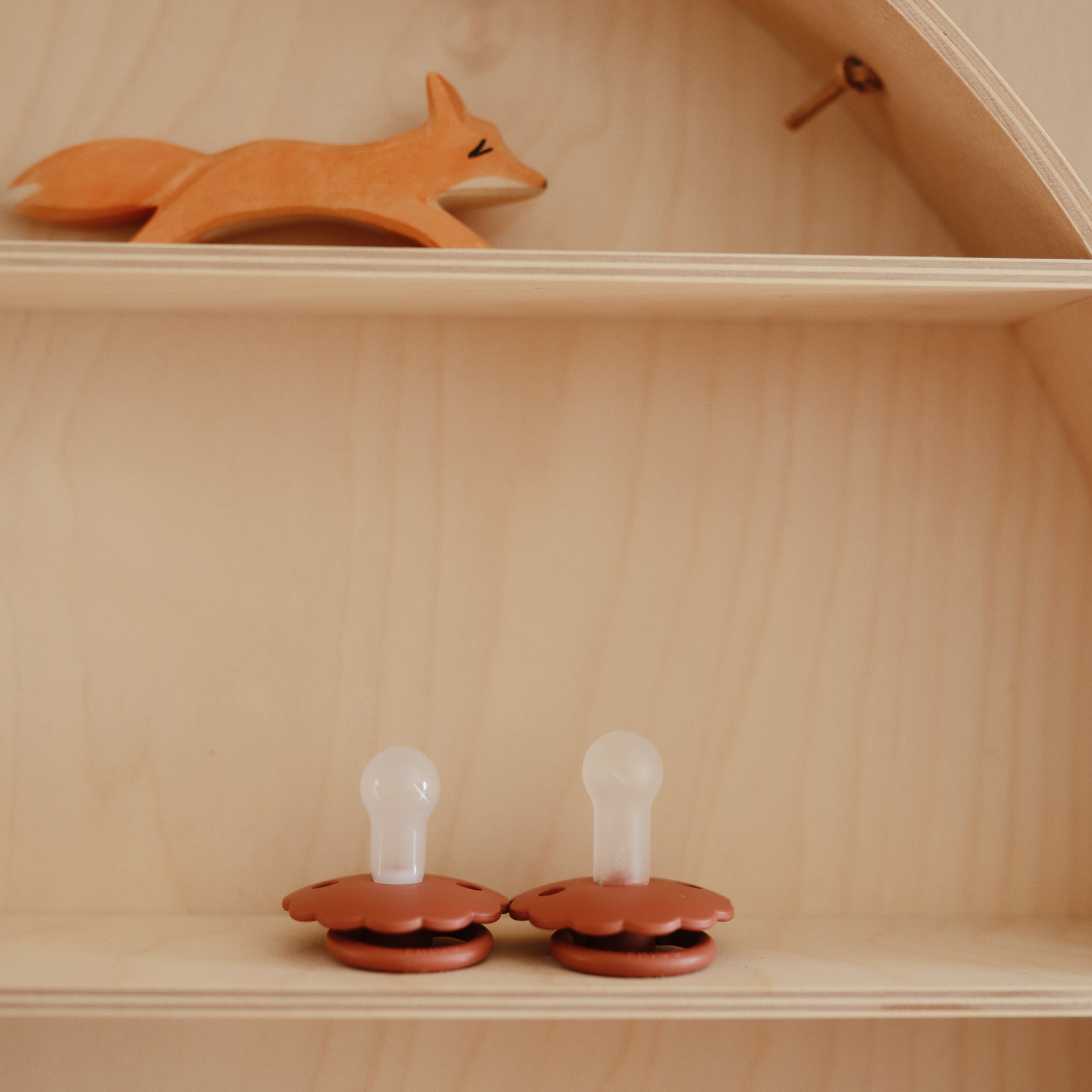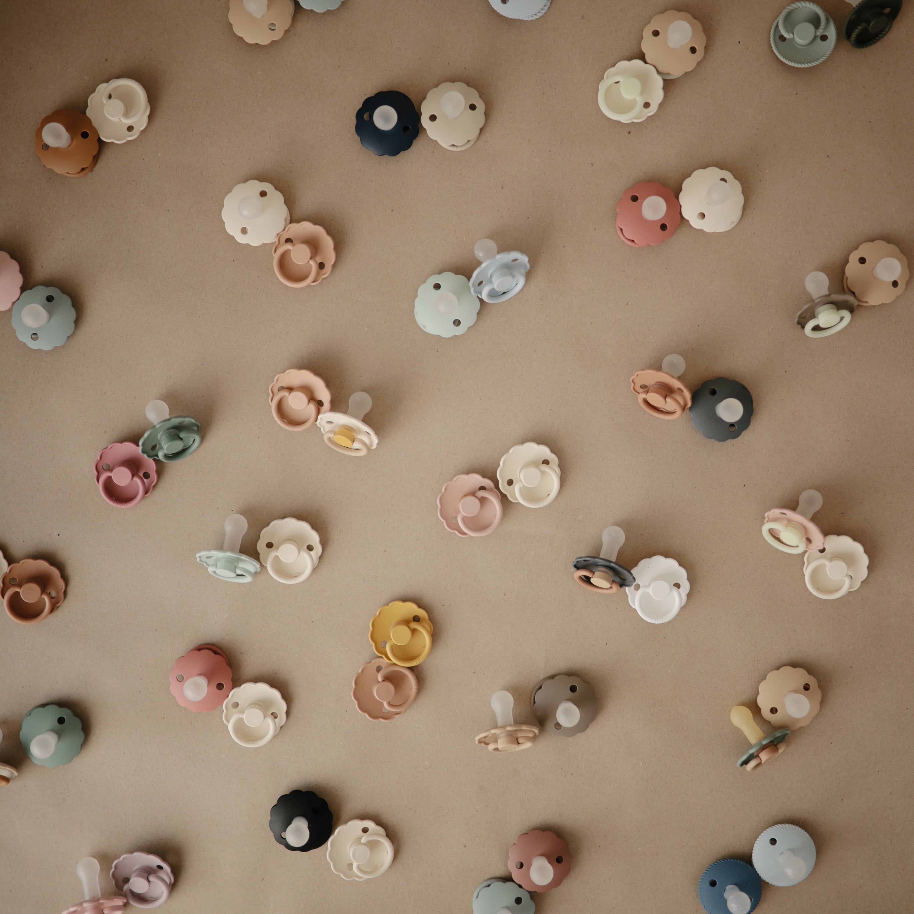 The FRIGG line of Daisy silicone pacifiers are thoughtfully designed and made in Denmark for your baby's comfort and safety with an improved SilkySoft™ medical grade silicone nipple and patented Click-Lock® system. The outward curve keeps the pacifier off baby's delicate skin, while air holes and a security handle give parents extra peace of mind. The charming daisy-shaped shield adds a sweet, playful touch to your baby’s everyday essentials.