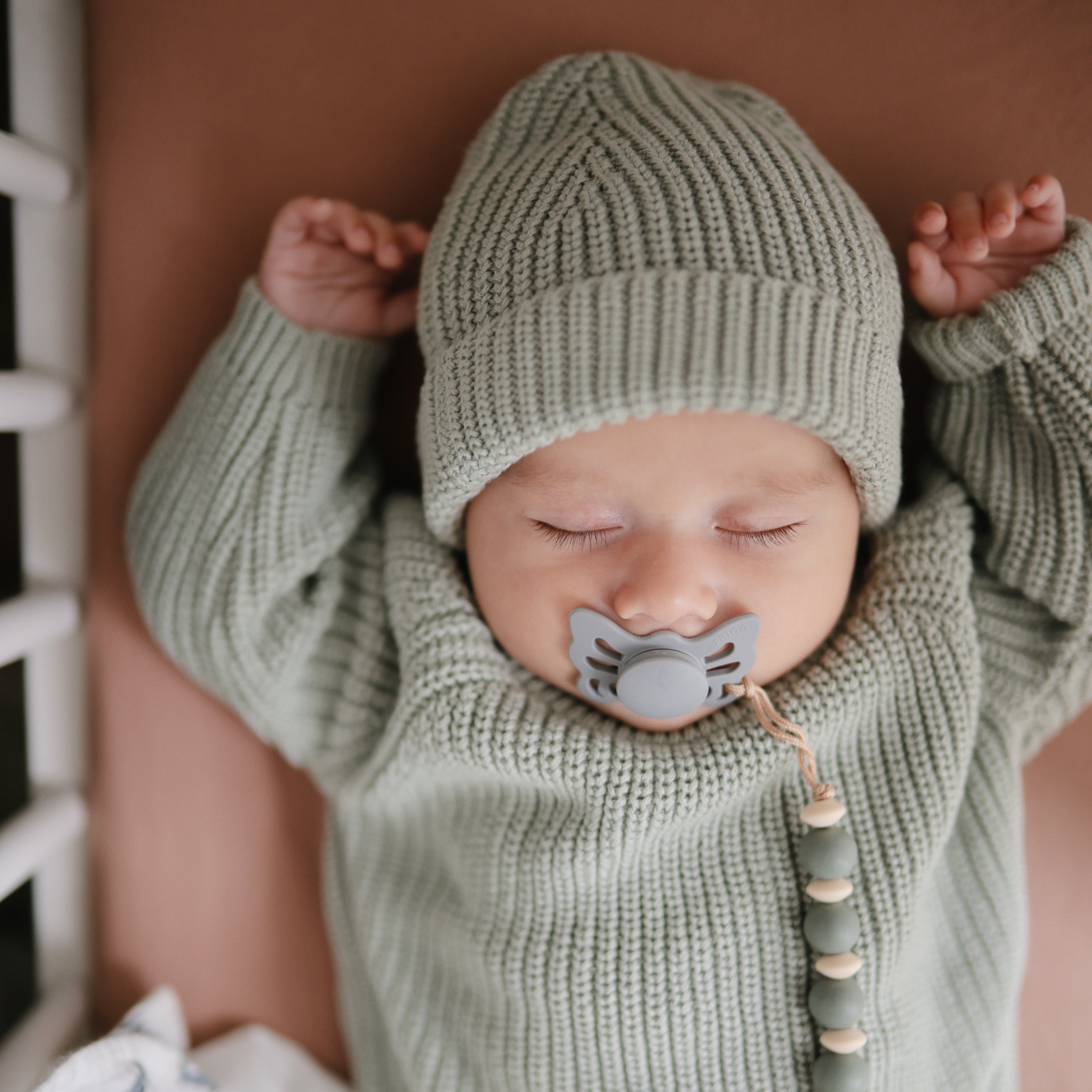 FRIGG Lucky silicone pacifiers are thoughtfully designed and made in Denmark for your baby's comfort and safety with an improved SilkySoft™ medical grade silicone nipple. Inspired by the rare four-leaf clover, the shield mimics the leaves of a clover and has large air holes for added safety. FRIGG Lucky features a symmetrical, flattened teardrop-shaped nipple that fits naturally in baby’s mouth—no matter the position. Its flatter neck helps reduce pressure on the palate and gums, supporting healthy oral and jaw development.
