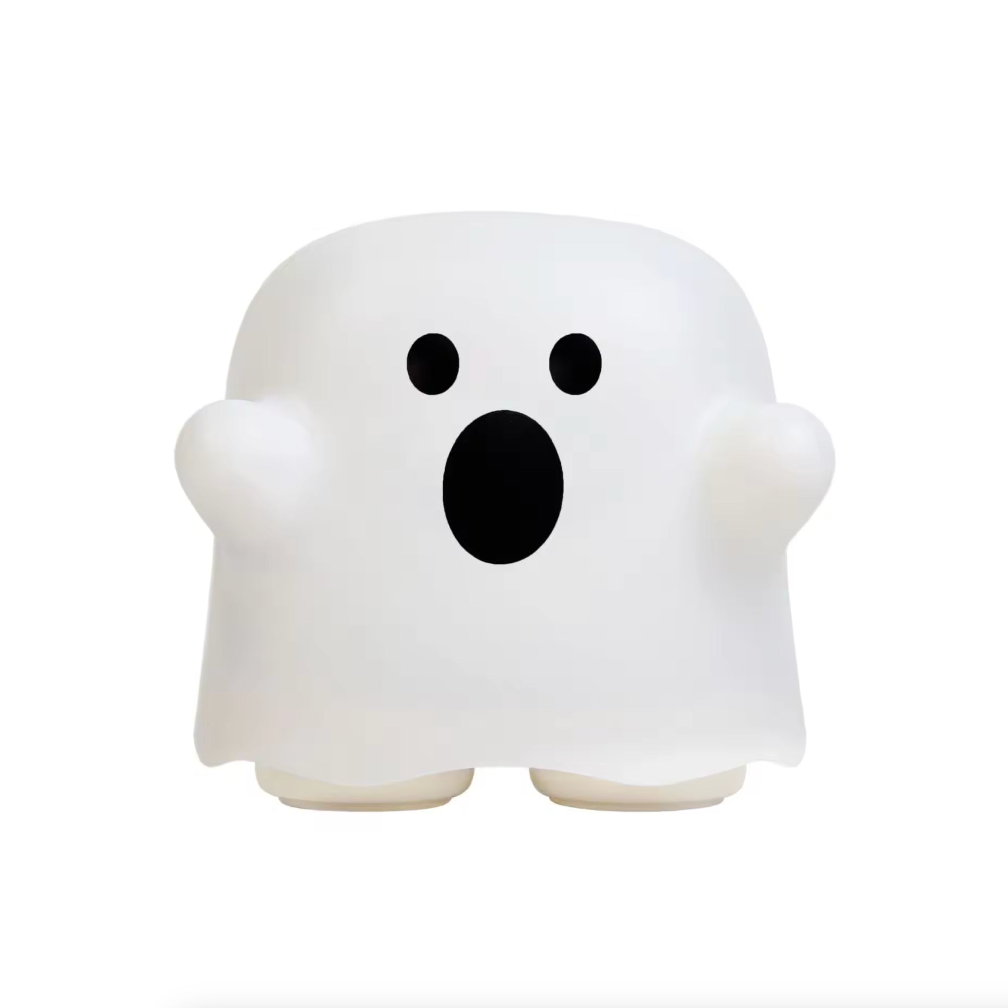 This ghost lamp/night light is just SO fun! This ghost features a surprised face in black, 2 little legs that serve as both a base as well as the switch to turn it on. Press down to change the brightness...yes it has a dimmer! This item is made of silicone and is rechargeable. Fantastic for spooky nurseries! USB plug (block not included but cord is).