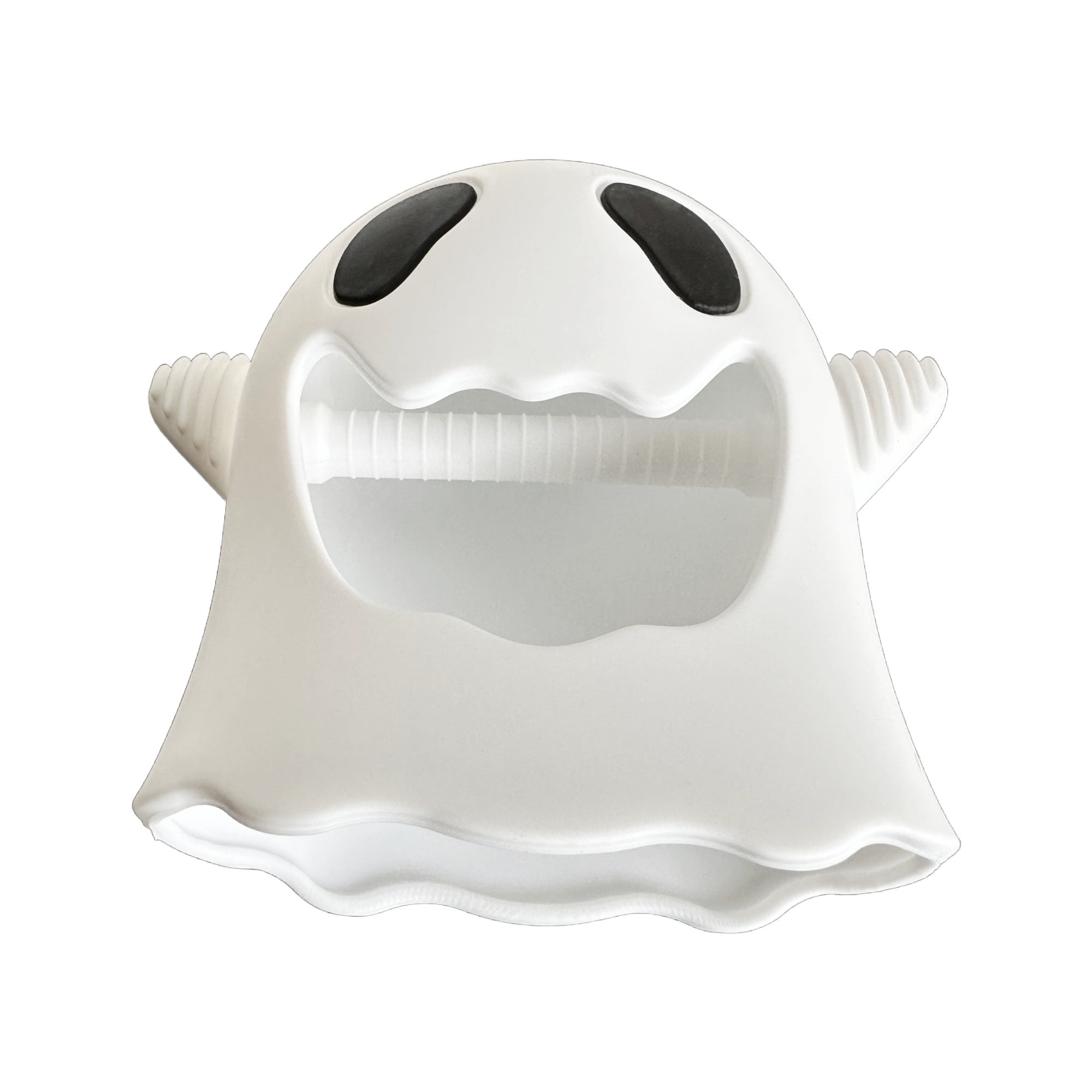 Teething is hard, but this spoopy cute ghost teething mitten helps! It features a white ghost with an open bottom so baby can stick their hand in...it covers their hand and protects it from their little munches. Inside is a silicone bar for them to grab onto. BPA free and food grade silicone.