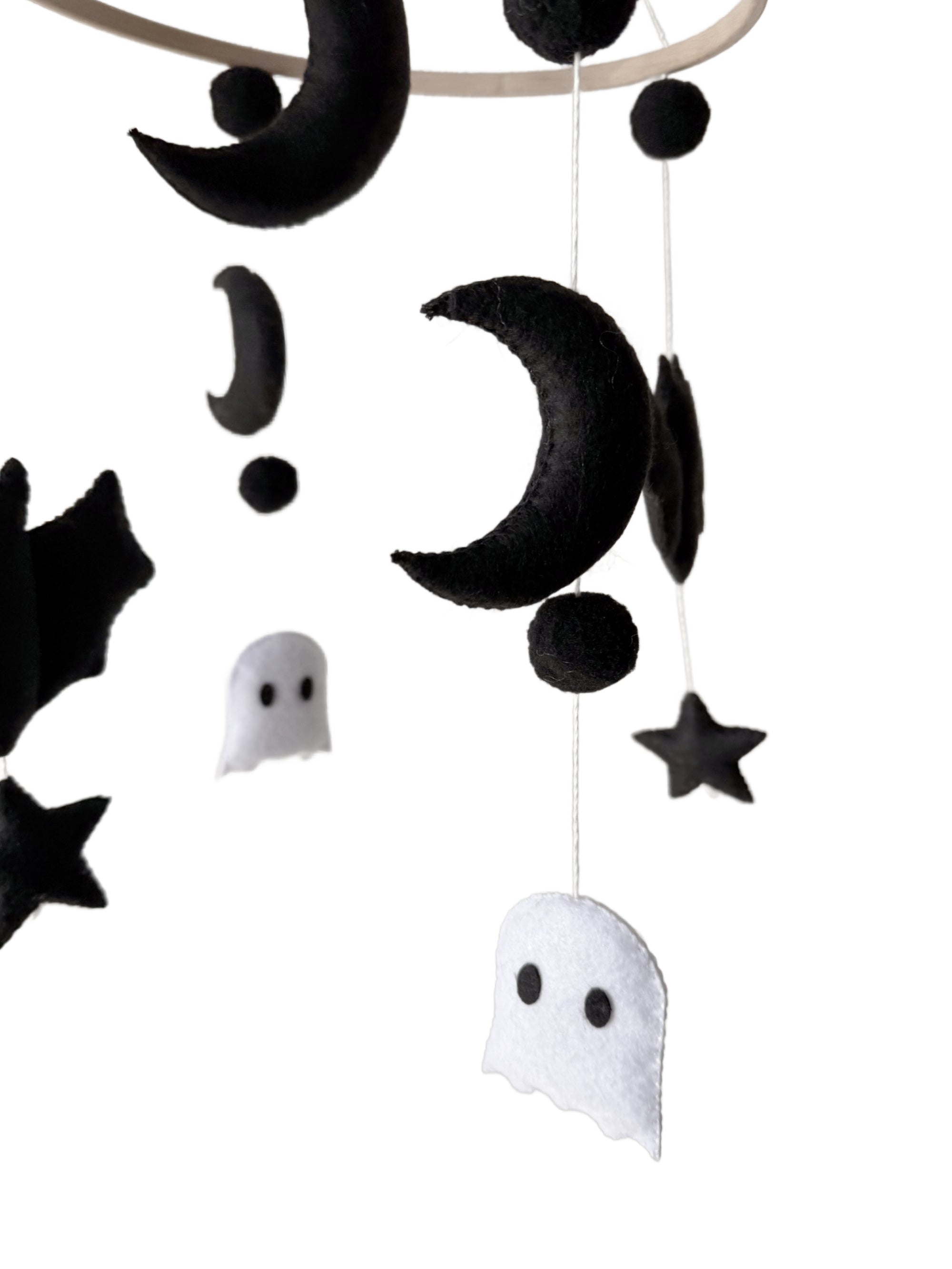 We have been working on these felt mobiles for SO long and they are finally here! This wooden hoop mobile features oodles of black/white felt shapes that are both cute and spooky...the best combo! There is a large black crescent moon in the center and black bats/white ghosts adorning the strings. Sprinkle in some black stars for a bit more of a celestial vibe. There is a silver, metal hoop at the top for easy hanging. The hoop is 9" across and from loop to the bottom is 22".