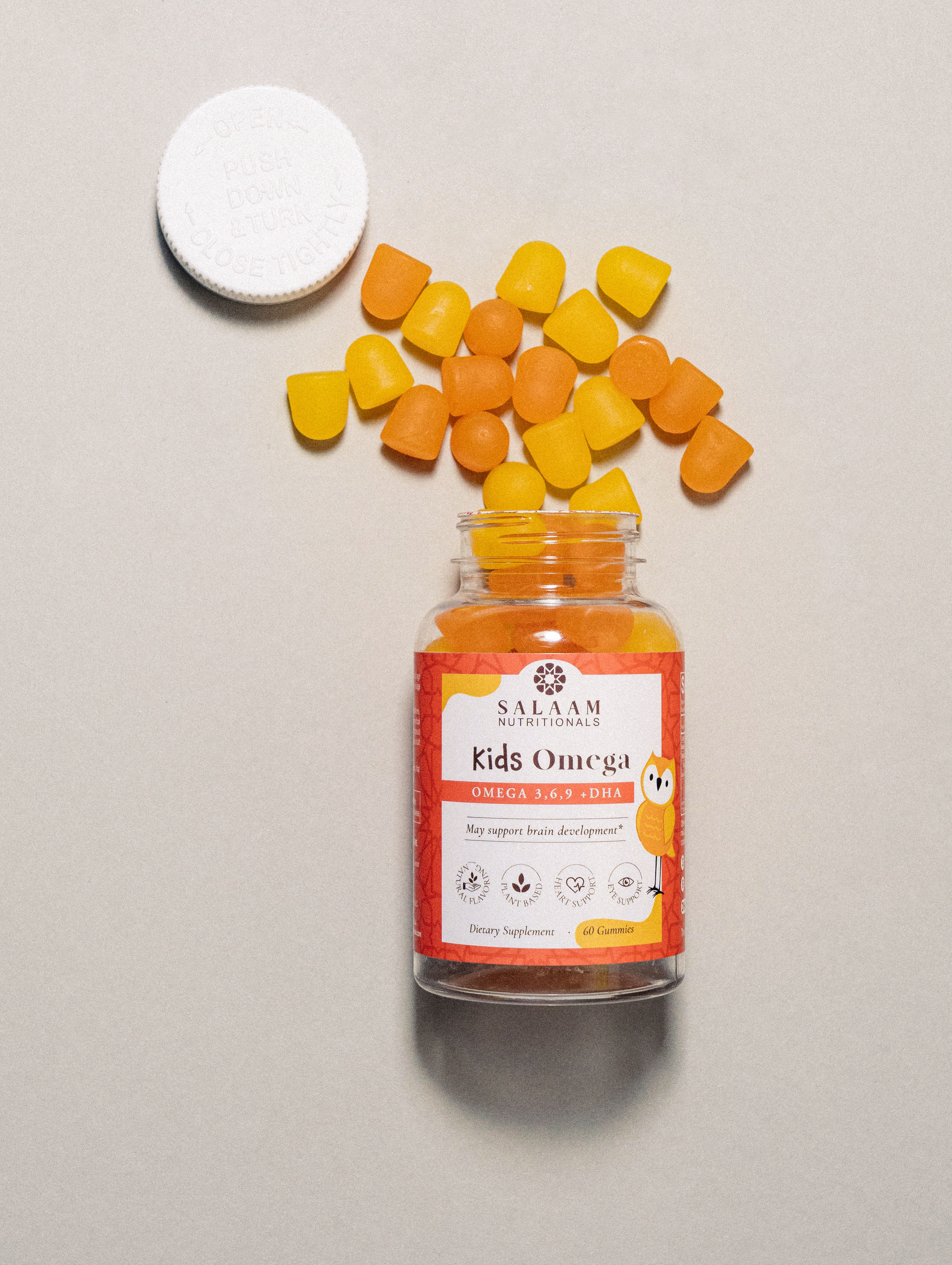 Elevate your child’s nutrition with Salaam Nutritionals Halal Kids Gummy Omega 3, 6 & 9 + DHA. These delicious, fish-free gummies are designed to support brain function, heart health, and immune system strength. Available in tasty orange and lemon flavors, they provide essential Omega-3, 6, and 9 fatty acids and DHA in a fun, chewable form. Ideal for picky eaters, our gummies are Halal, Kosher, vegan, and free from gluten, dairy, and nuts.