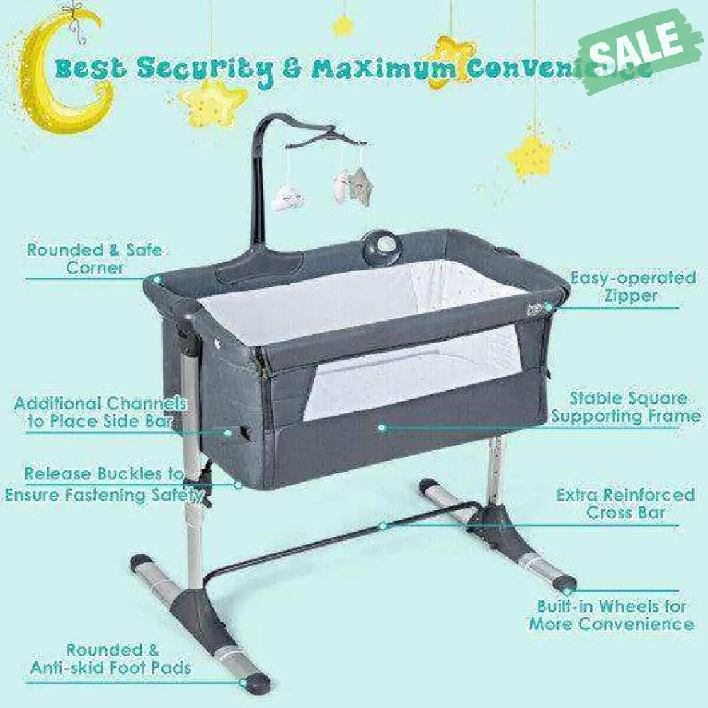 This bedside baby crib is of adjustable height and can match any types of beds or sofas. It is very convenient for you to care for the baby at night.