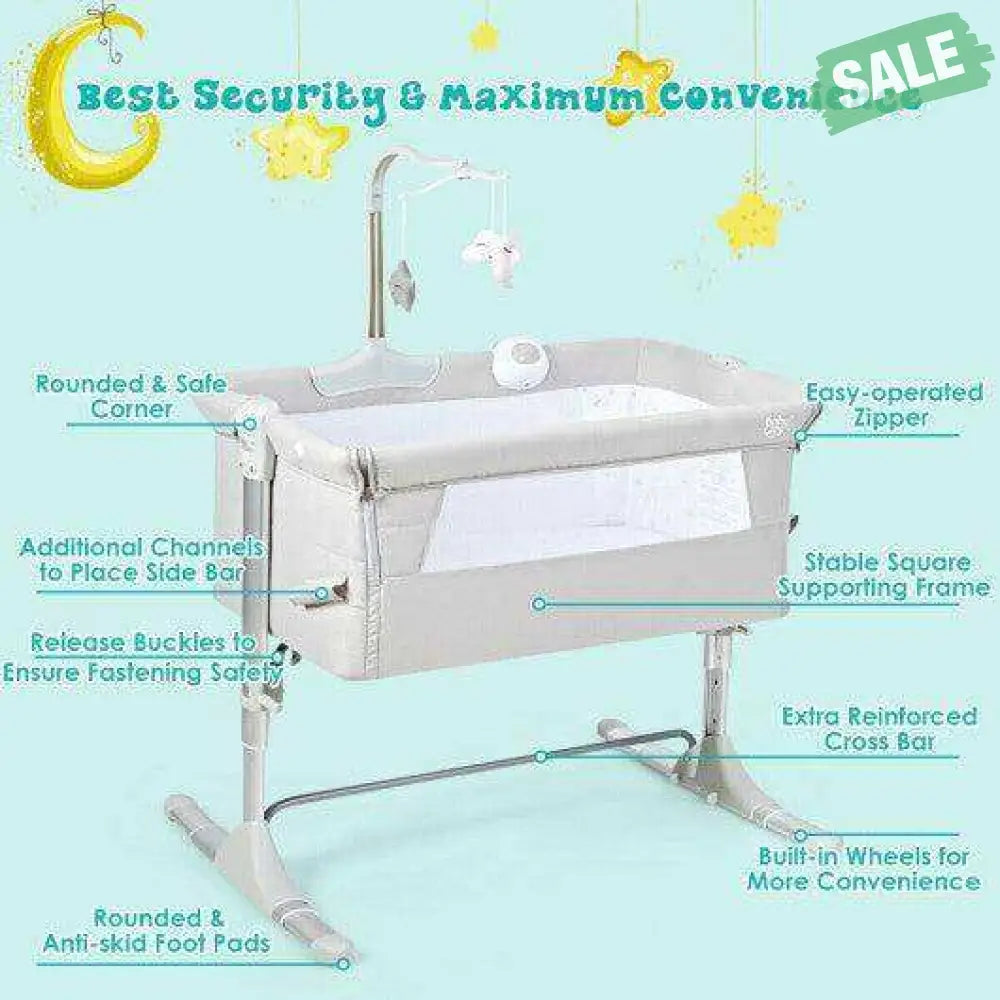 ● Enjoyment at Sleeping Time: A toy rack and a music box have been attached to the baby crib bringing much fun for the baby. Toys can help your baby practice grasping while the music box with light and soothing vibration can ease baby into sleep without nursing and improve the cognitive ability of the baby.