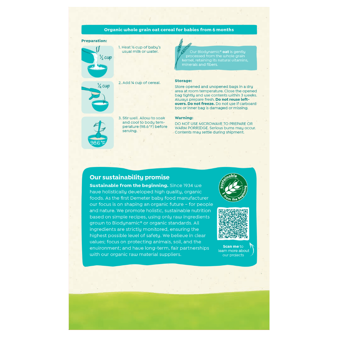 Holle Organic Whole Grain Oat Cereal provides a wholesome start for babies beginning solid foods. These organic grains are grown using biodynamic farming methods that promote sustainability and soil health. This cereal is free from artificial flavors, preservatives, added sugars, and GMOs, making it a pure and natural choice for your baby’s diet.