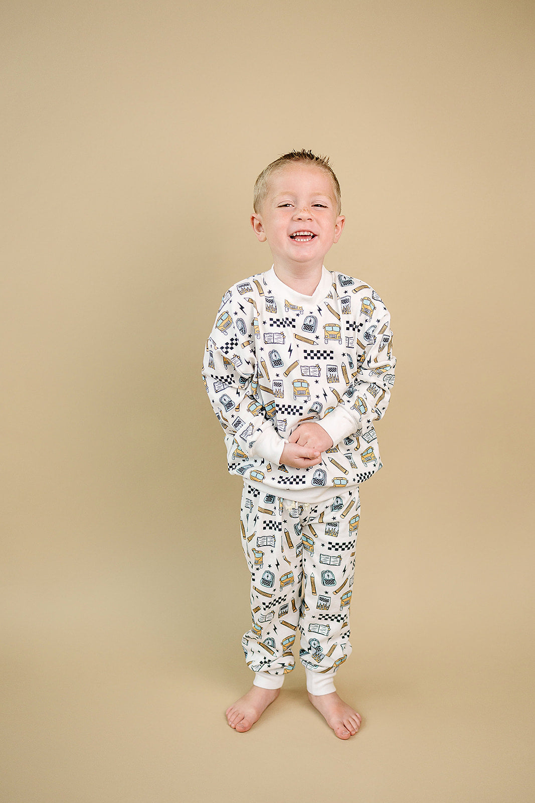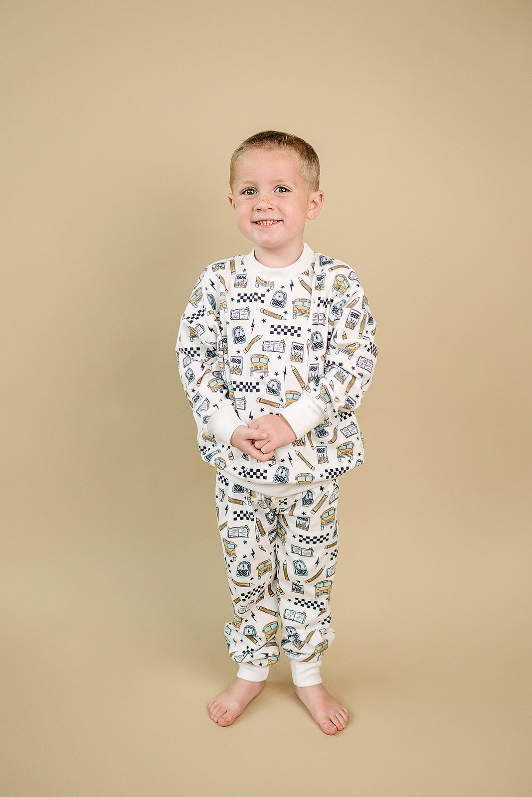 Notebooks, pencils, lightning bolts, and school buses. The Jogger Set | Back 2 Cool brings all the classroom energy in one bold, comfy set. Perfect for first day pics, hallway walks, and snack-time chill.
