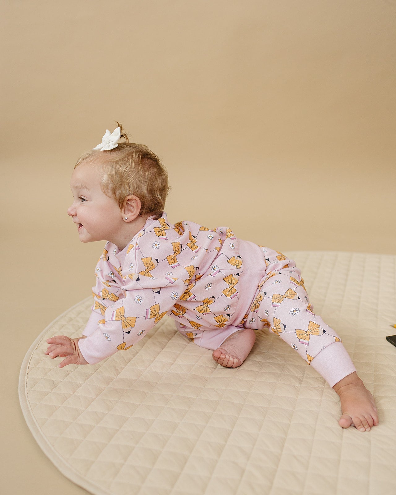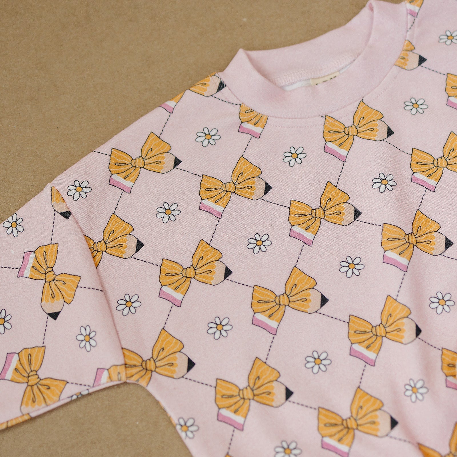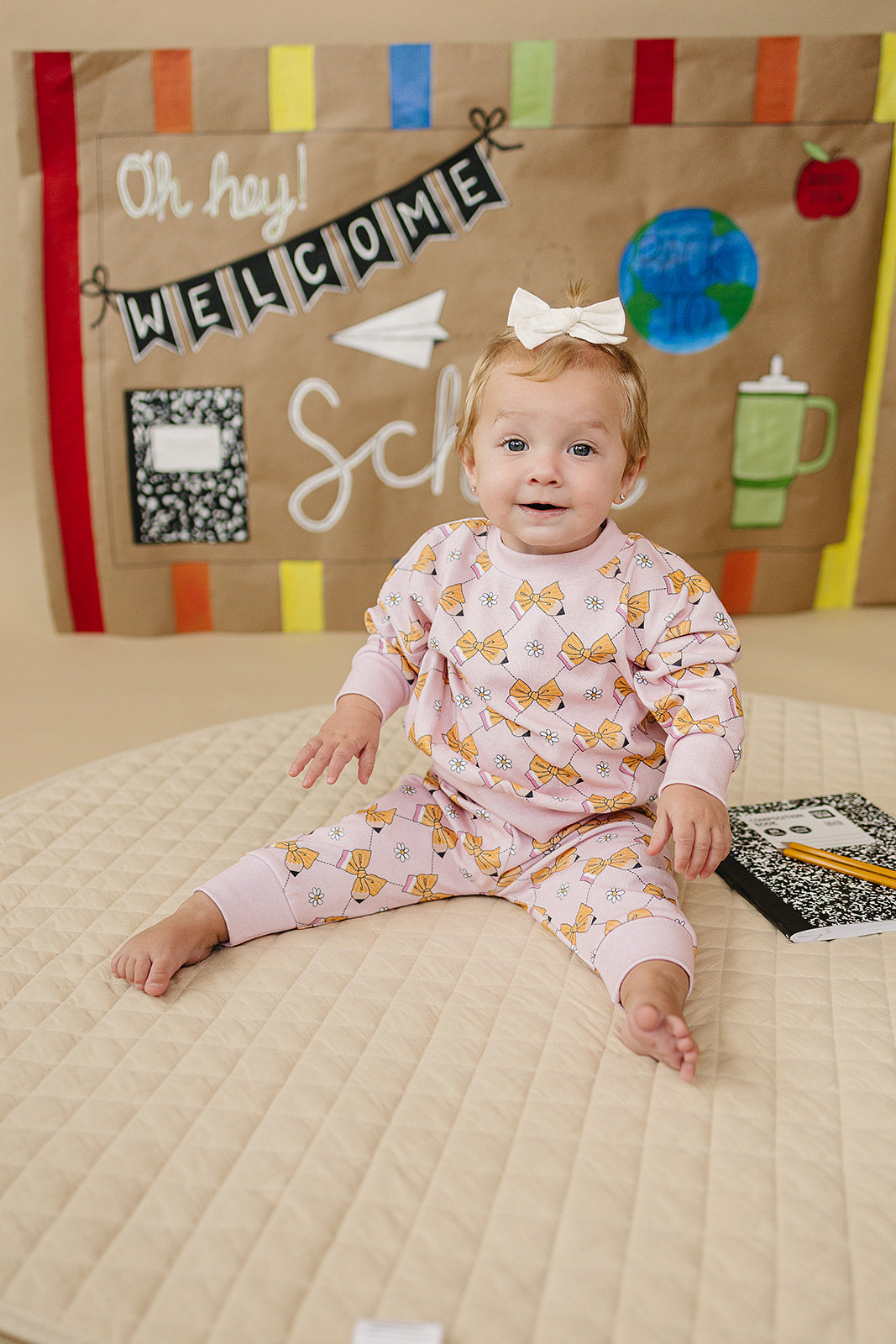 Pencil bows, daisy doodles, and the dreamiest shade of pink. The Jogger Set | Pixie Pencil is ready for recess, reading time, and after school snuggles.