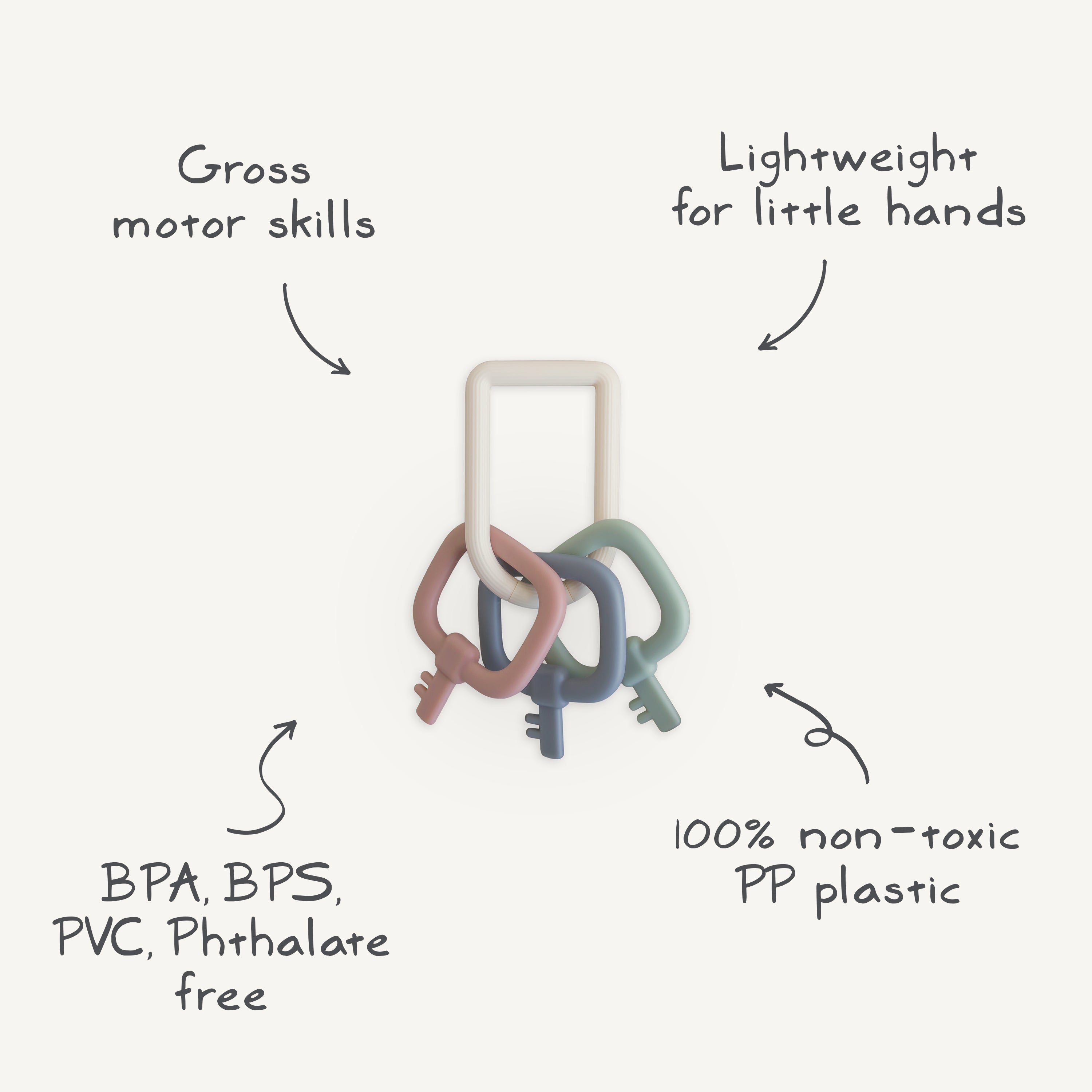 Unlock your little one’s imagination with our spin on a classic key toy reimagined in soothing colors. The lightweight key ring is easy for little hands to grasp and shake, making a gentle click-clack sound. Made of non-toxic plastic that is easy to clean and gentle on teething gums.