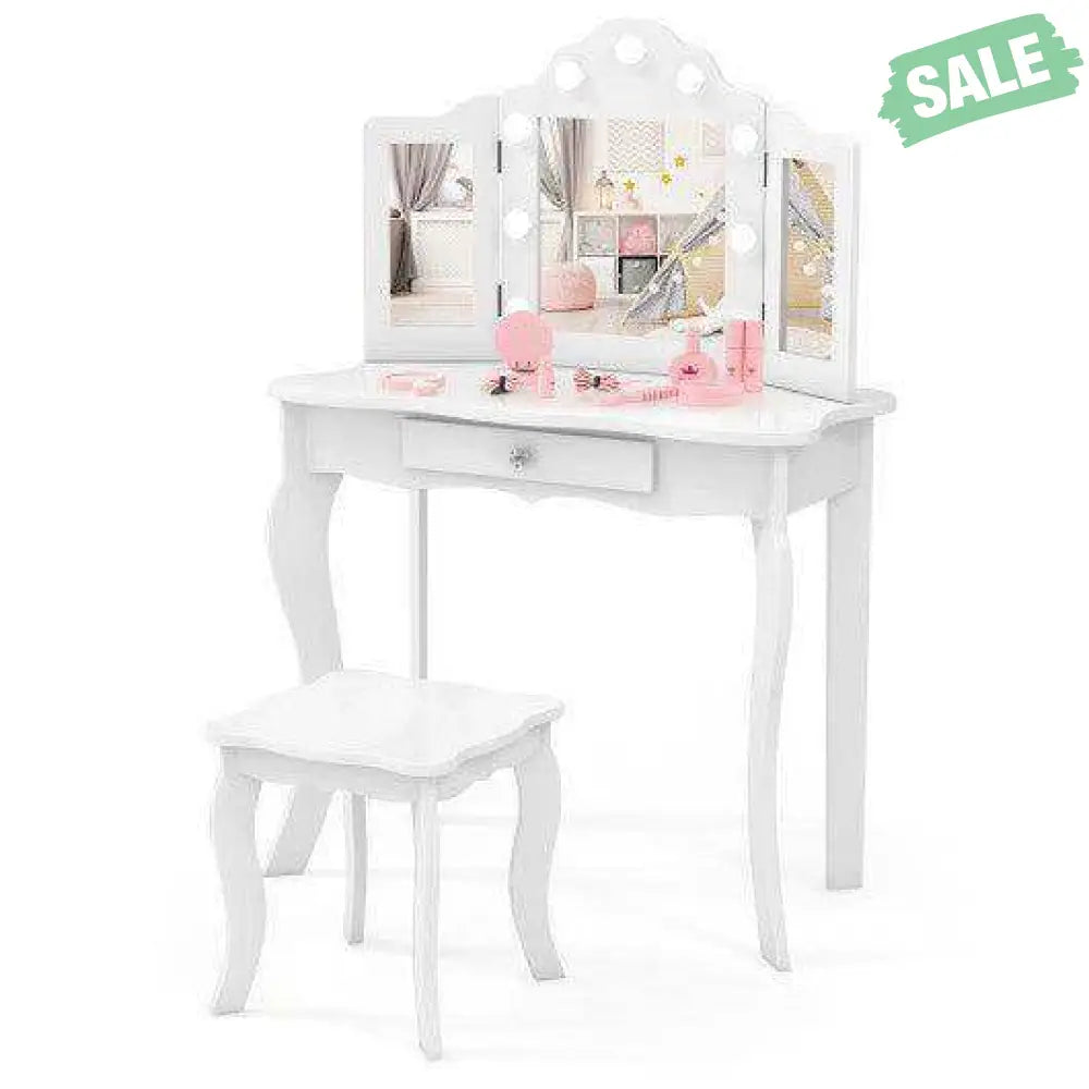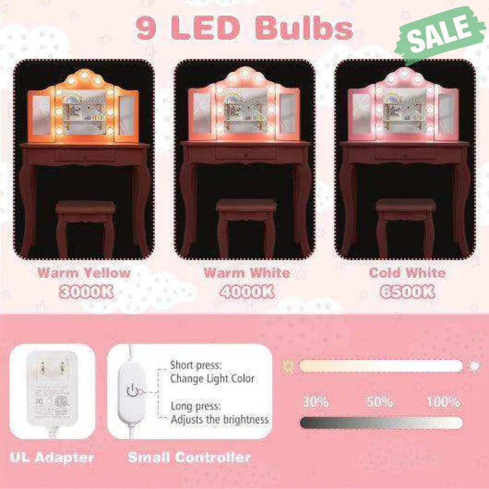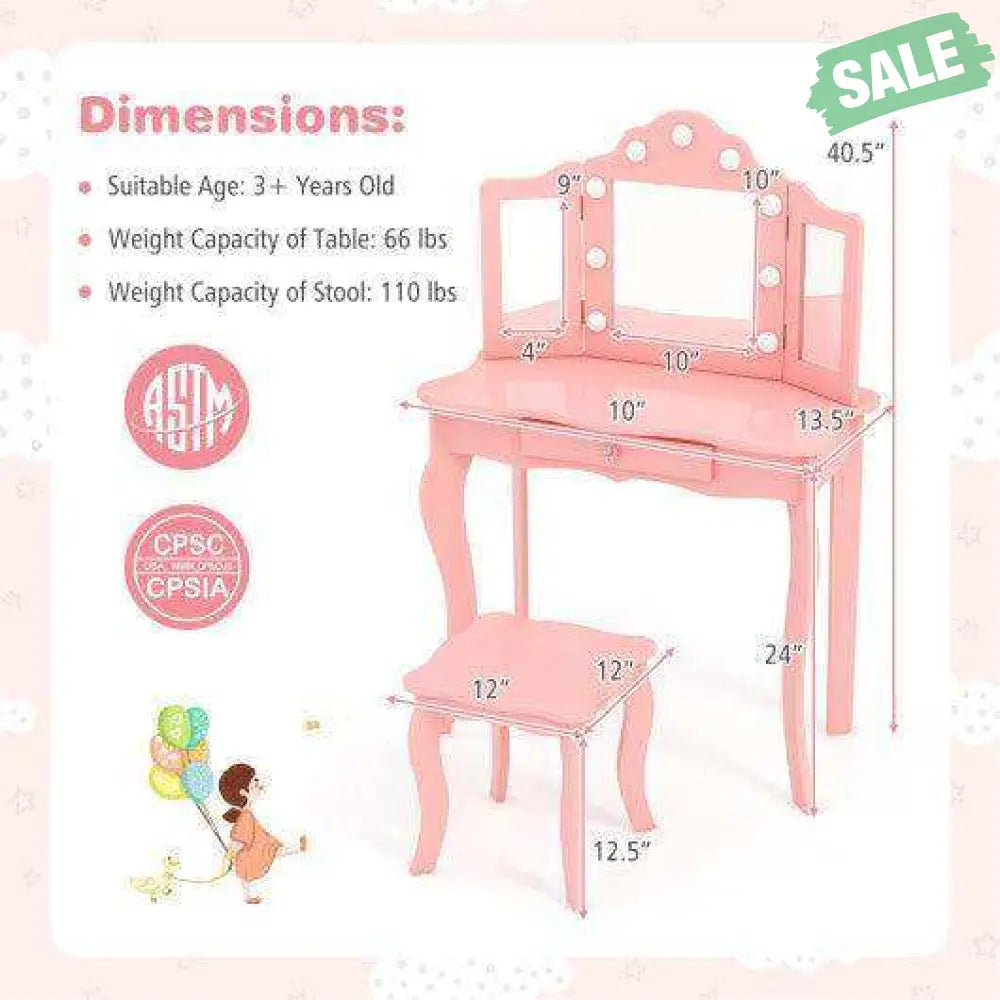 ● Princess Dream Comes True: This adorable vanity table set will be a great addition to your little princess's room which is a perfect gift choice for birthdays Christmas and more. The tri-folding silver mirror allows kids to find the optimal angle.