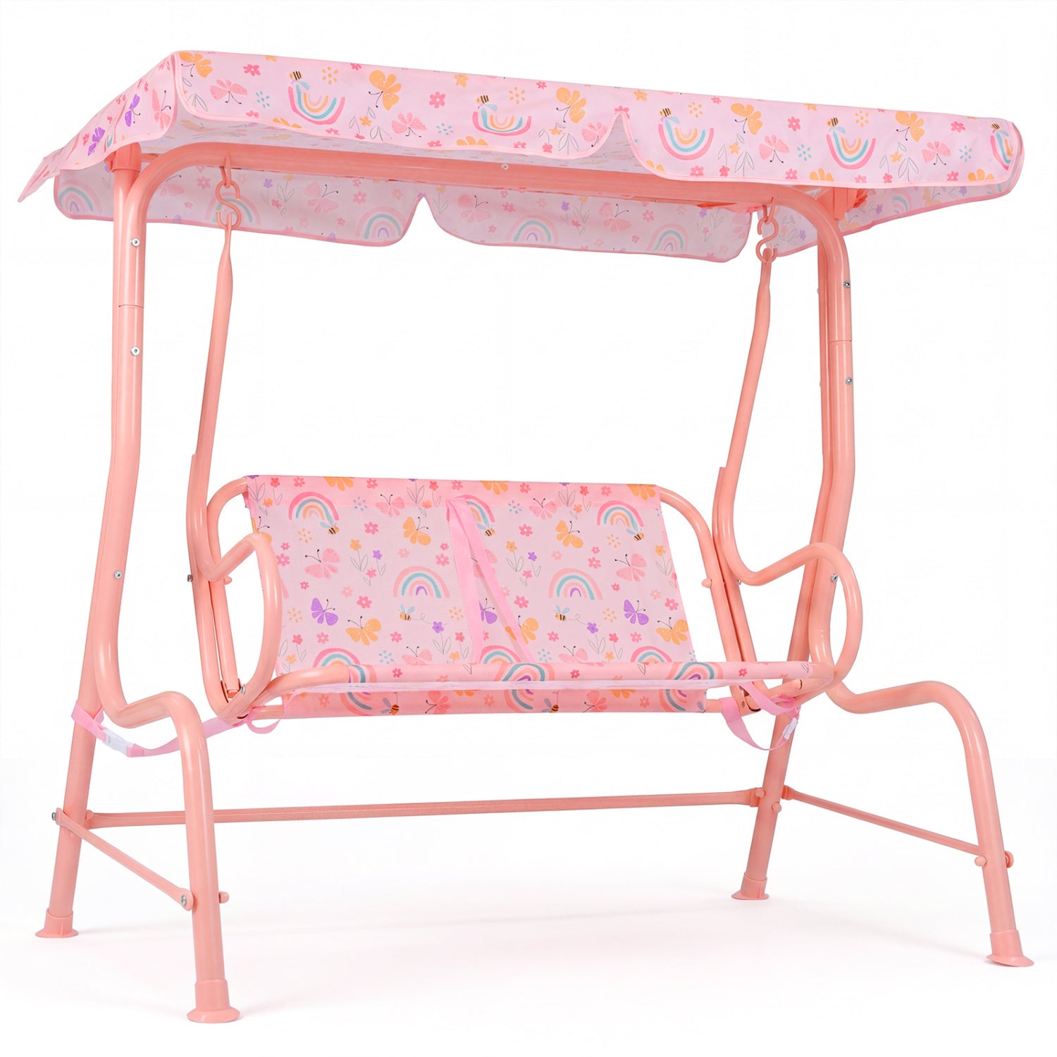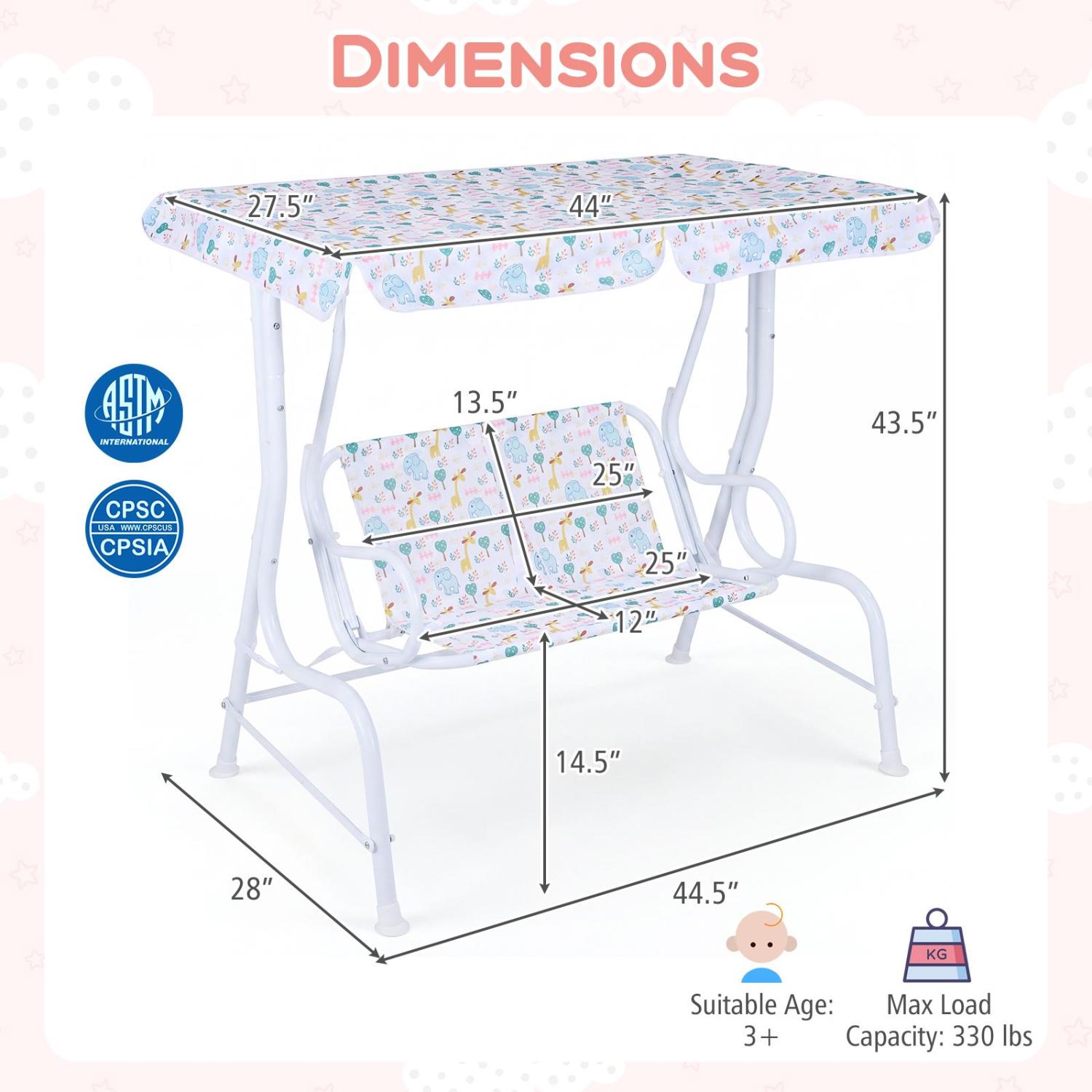 Color Pink/White Material Metal 210D Oxford Cloth PP Overall Dimensions 44.5" x 28" x 43.5" Size of Canopy 44" x 27.5" Size of Backrest 25" x 13.5" Size of Seat 25" x 12" Height of Seat 14.5" Max Load Capacity 330 lbs Adjustable Angle Range of Canopy ± 90° Suitable Age 3+ Net Weight 20 lbs Box QTY 1(May vary by batch) Is Assembly Required Yes