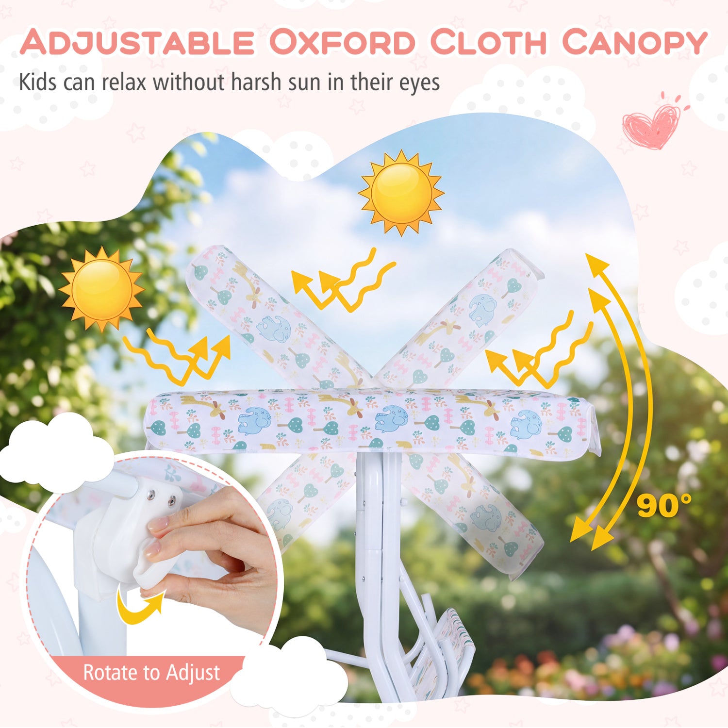 - Rotate to adjust the adjustable oxford cloth canopy for a perfect sun shade
