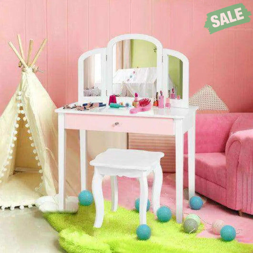 The vanity set has been tested from EPA and the paint we choose is lead-free and has no peculiar smell. Comes with a tri-folding mirror your little one can adjust the angle of mirror conveniently to get much light and make up better. The dresser also has a drawer to help store small items such as hair ties brushes makeup nail polish and other fun trinkets. In addition the mirror can be removed and the table is also can be used for writing or reading. Designed in pretty and cute appearance the vanity set will add a touch of elegance to your child's room.