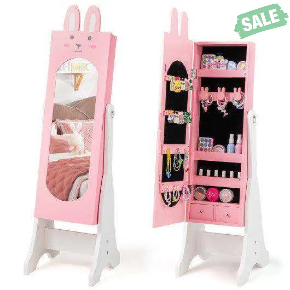 ● Multiple Storage Options: The vanity table includes 2 drawers and a shelf to store your kid's cosmetics combs hair clips or other small items. Moreover the jewelry cabinet features 18 earring slots 6 necklace and bracelet hooks 4 storage shelves 3 bunny bracelet rods and 2 small drawers to organize your child's precious jewelry neatly.