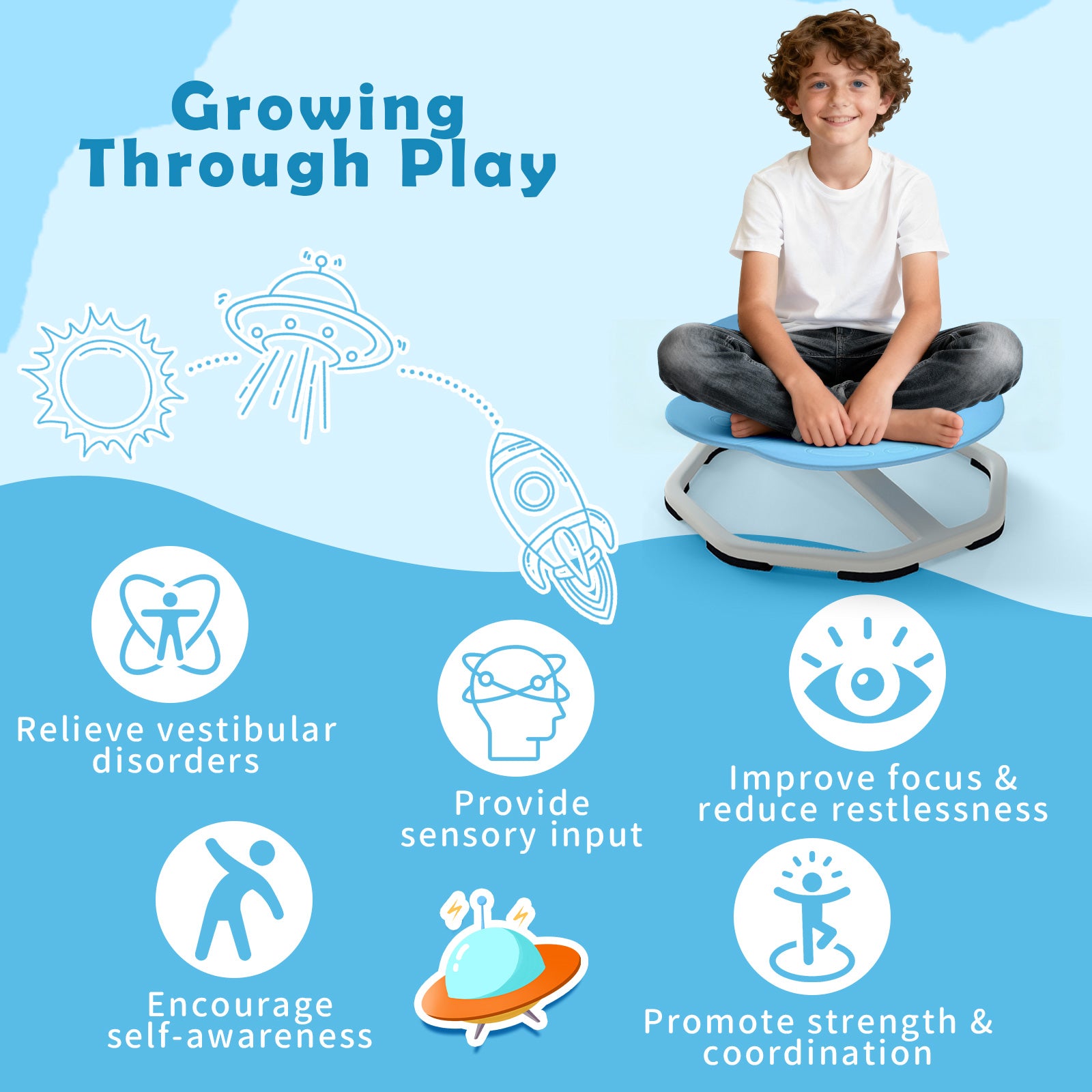 â Promote brain development and body coordination â Strengthen grip core muscles and exercise balanceâ Play in various ways such as sitting lying down and kneelingâ Non-slip foot pads add a layer of stability and safetyâ High-grade PP seat for long-term use and easy cleaningâ Adorable elephant/planet shape for added enjoymentâ Built with rounded edges to prevent accidents â Ball bearings for smooth and quiet rotationâ Ergonomic curve ensures continuous comfort â Heavy duty metal base loads up to 220 lbsâ Effortless assembly no extra tools required
