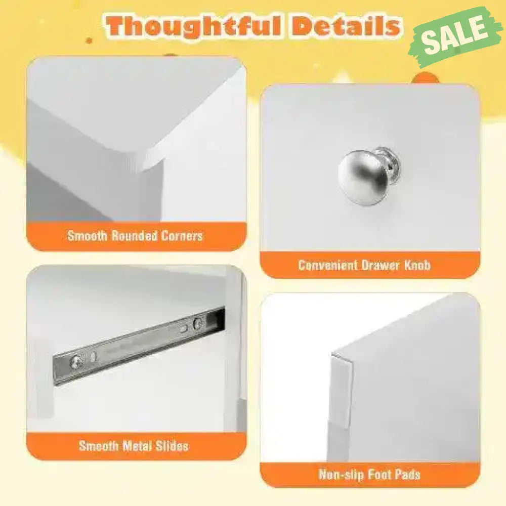 ‚óè Thoughtful Details: The large drawer is designed with a convenient drawer knob and smooth metal slides for quick opening to access items. In addition smooth rounded corners without sharp edges are designed to avoid accidental scratches on your child ensuring higher safety.