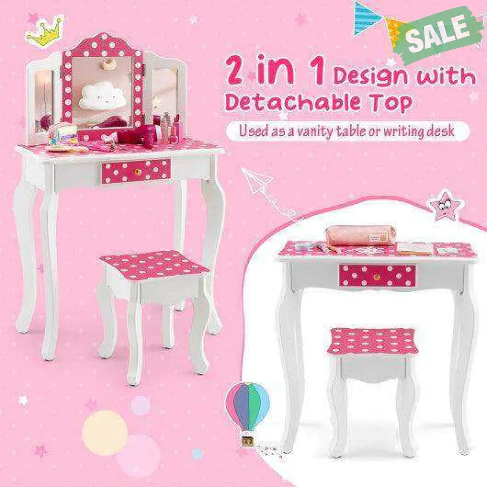 This pink and white dressing table and stool set are designed with adorable polka dots which will attract kids' attention at a glance and make them fall in love with it. The tri-folding real mirror can reflect the face clearly in all directions offering convenience for kids to dress up or do hairstyles. The pull-out drawer provides plenty of space for holding makeup brushes toys and more. What's more this dressing table can also become a writing desk after the mirror is removed. Made of thick and durable MDF this vanity set is able to serve your child for long service life. The curved legs with anti-slip foot pads ensure great stability and can protect the floor from scratches. And the anti-toppling device at the back of the vanity table is designed for added security.