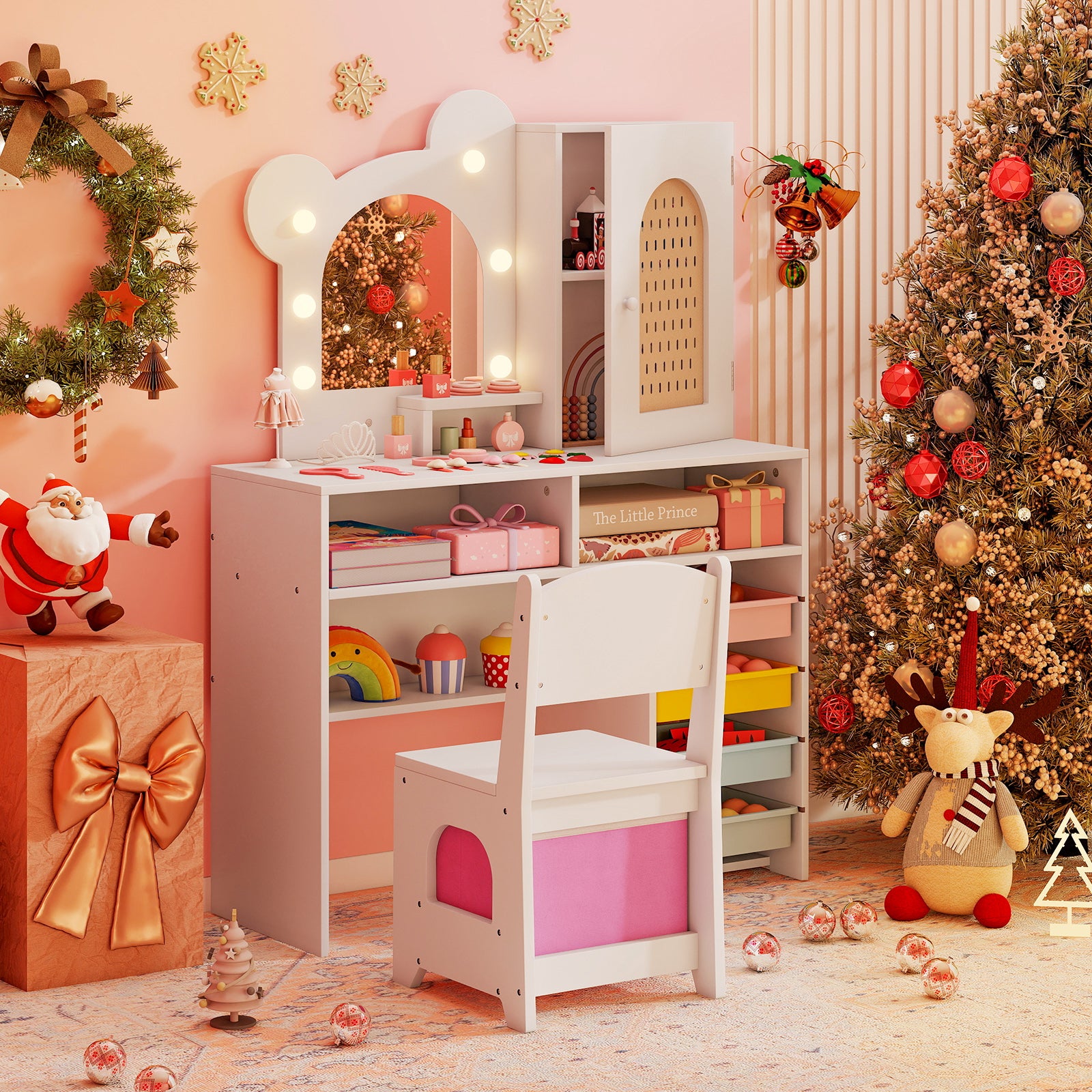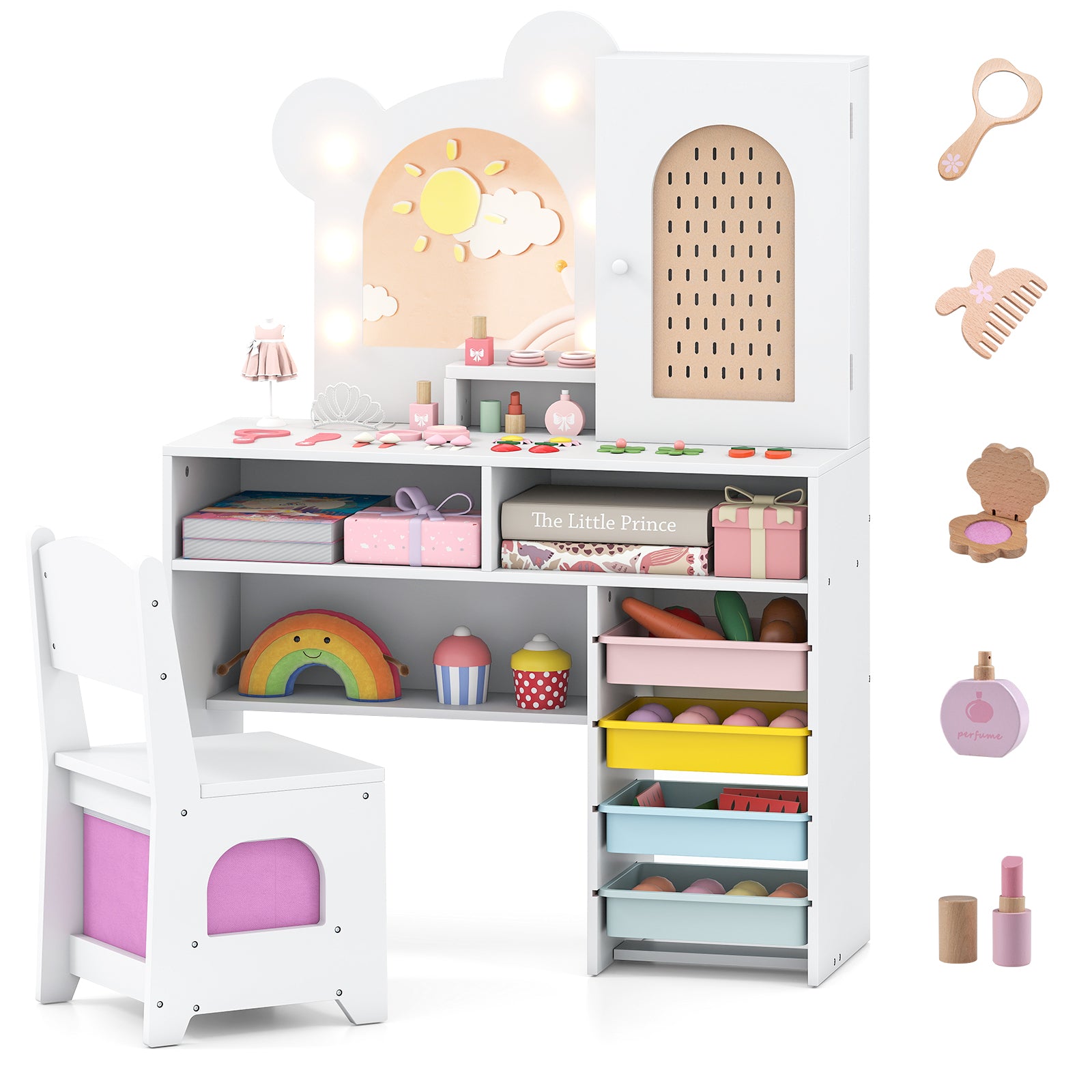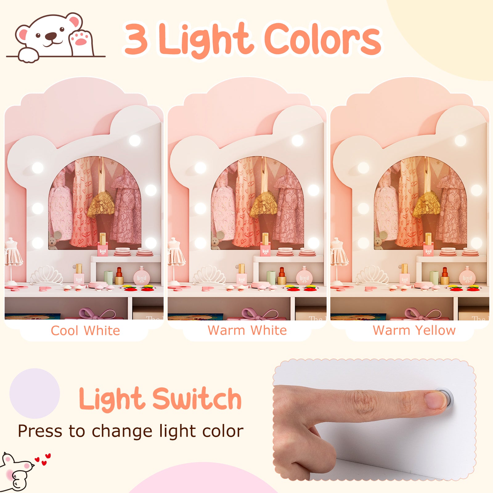 â 3 lighting modes(cool white/ warm white/ warm yellow) for kids to chooseâ Press to change light colorâ Adorable bear shape appeals to childrenâ Great for reading drawing playing or making upâ Shatter-proof acyclic mirror for a safe & child-friendly dressing areaâ Kid-sized chair for 3+ years old boys and girls to sitâ Inclined backrest and comfortable seat for ergonomic supportâ Smooth rounded corners for extra safe protectionâ Sweet accessories offer additional funâ Complies with ASTM/ CPSIA for high safetyâ Door stopper for tight closingâ Easy-to-clean surface for hassle-free maintenanceâ Assembly needed