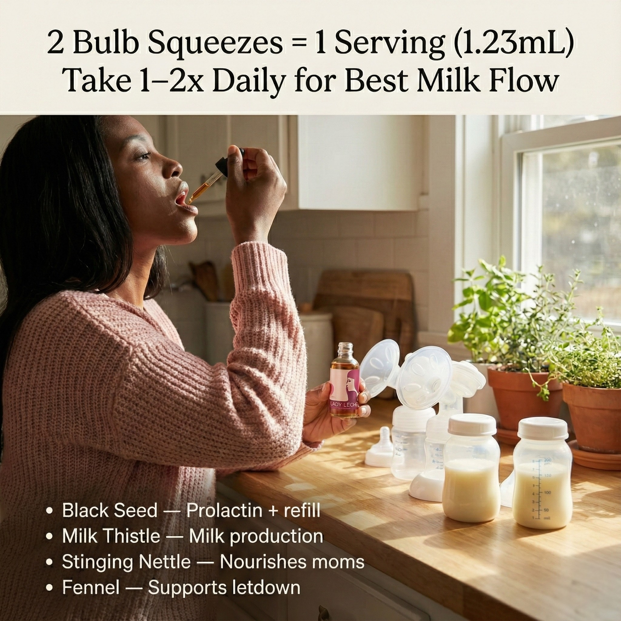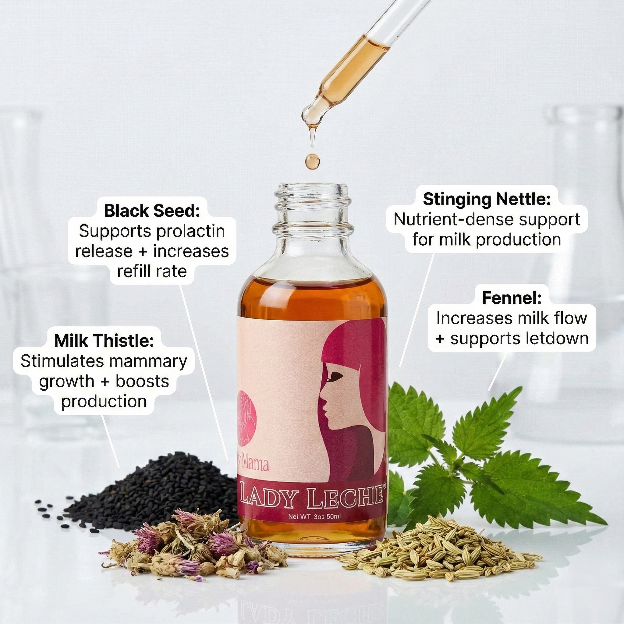 Lady Leche® is designed to promote healthy lactation, increase milk production, and enrich breast milk with a special blend of organic herbs. Black Seed is a nutrient packed seed believed to stimulate prolactin release, increase breast refill rate, increase milk production, and promote the growth of mammary tissue; Stinging Nettle Leaf is a powerful leaf believed to support lactation by providing essential nutrients and supports thyroid function; Milk Thistle helps increase milk production, stimulates mammary growth, and supports thyroid function; and Fennel Seed has been known to increase milk production and flow, stimulate the letdown reflex, enrich milk, stimulate mammary tissue growth, and helps ease gas/colic in babies.