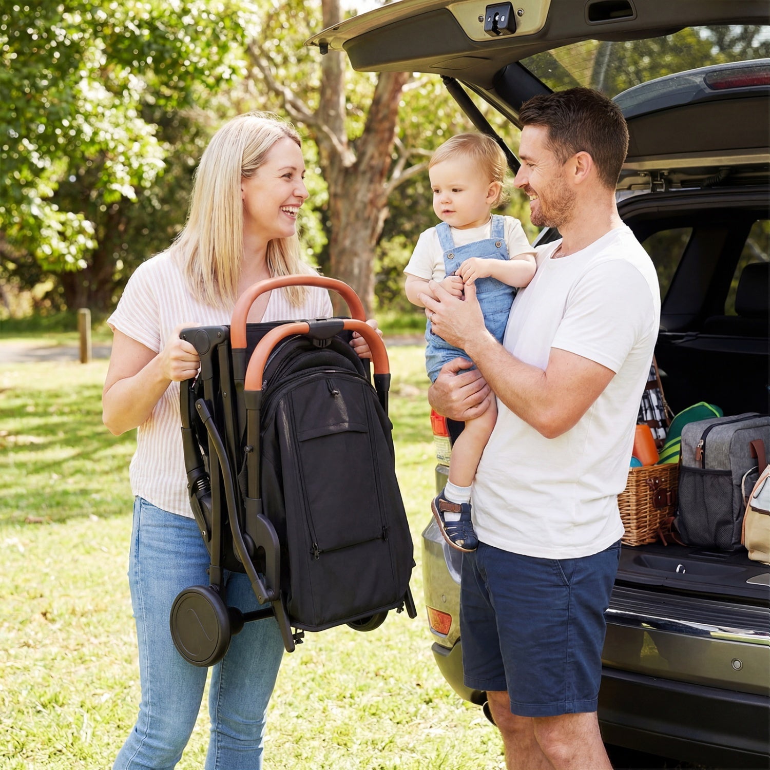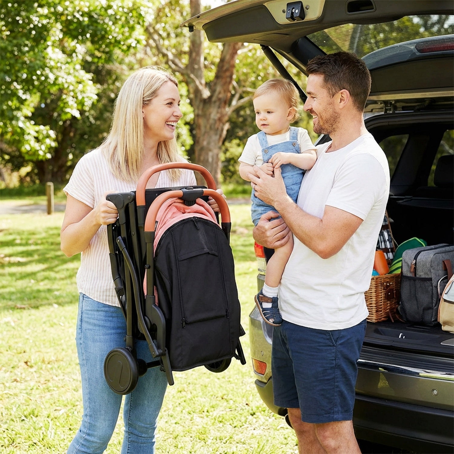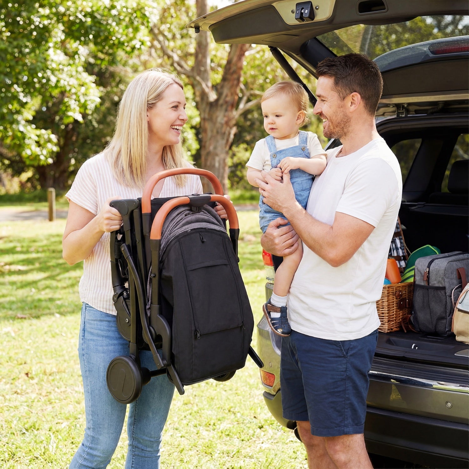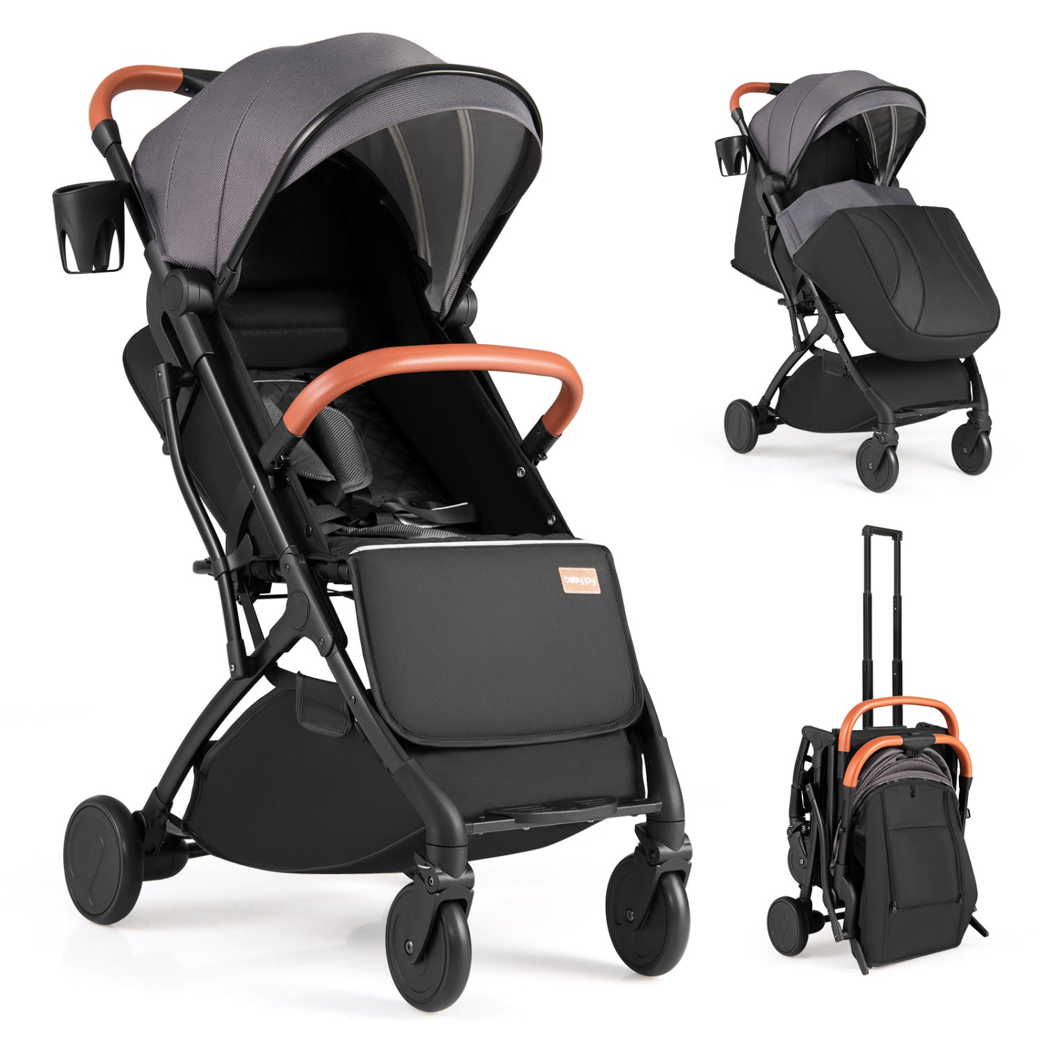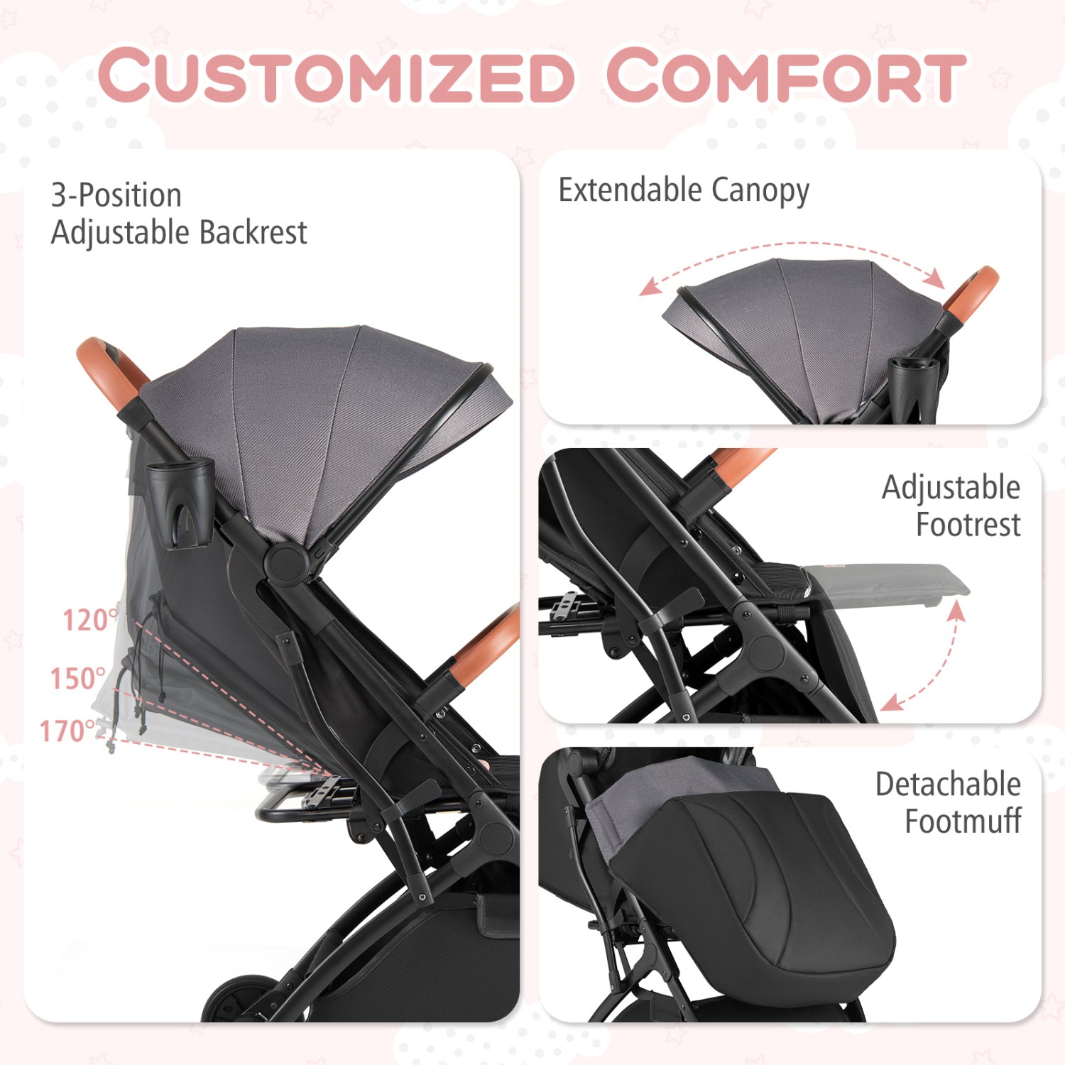 â Features adjustable canopy backrest and footrestâ Comes with a footmuff for year-round comfortâ Built with sturdy and shock-absorbing wheelsâ Simple control with universal front wheels and a foot brakeâ Easy to store or transport thanks to one-hand folding designâ Dual safety lock ensures secure operation by parentsâ 3-level telescoping handle allows you to carry with easeâ Quick to check on your baby with the peek-a-boo windowâ Convenient storage with a bottle holder and bottom basketâ Reliable safety during strolling with a 5-point harnessâ Constructed with a lightweight aluminum frameâ Complies with ASTM and CPSIA