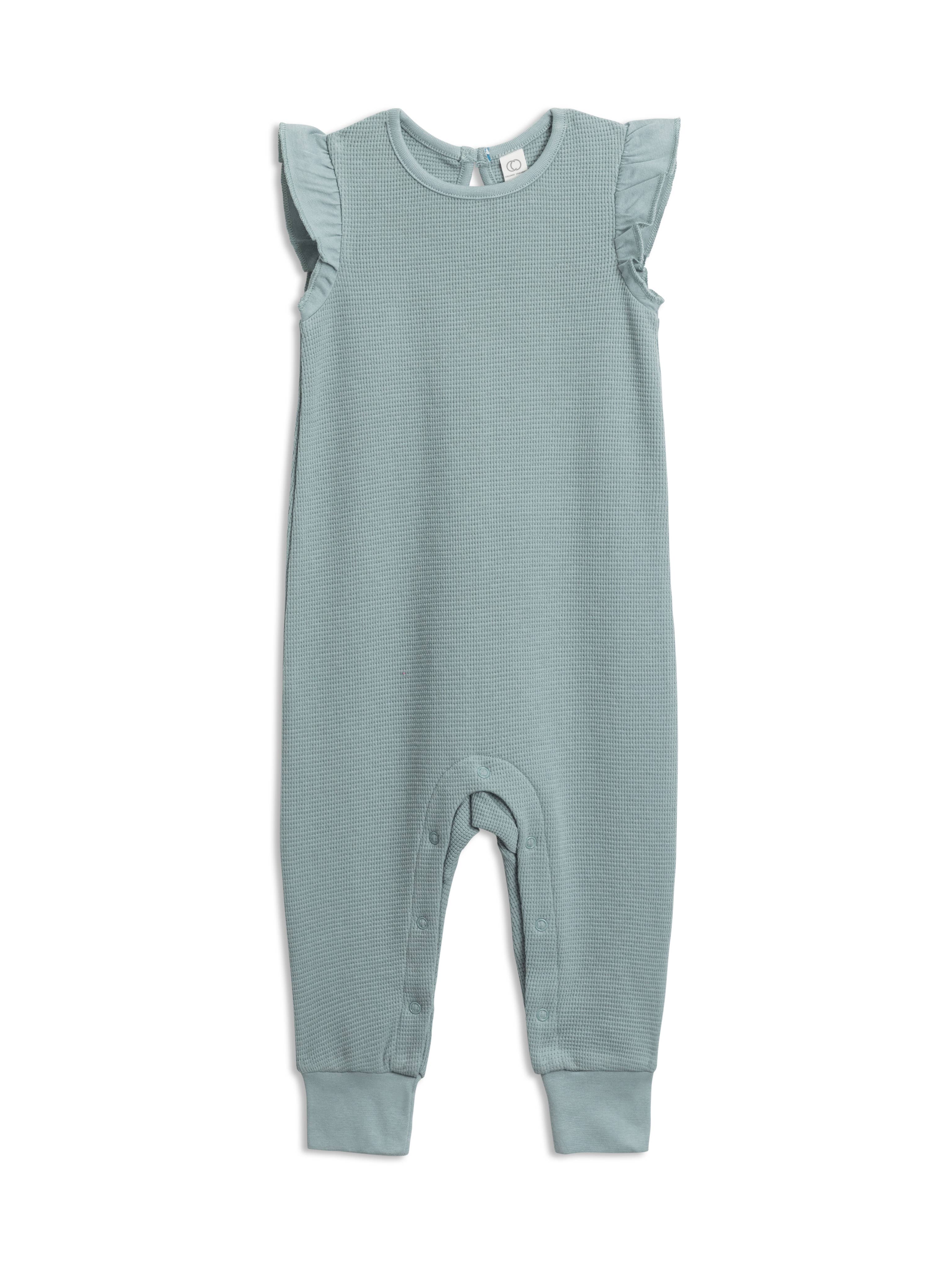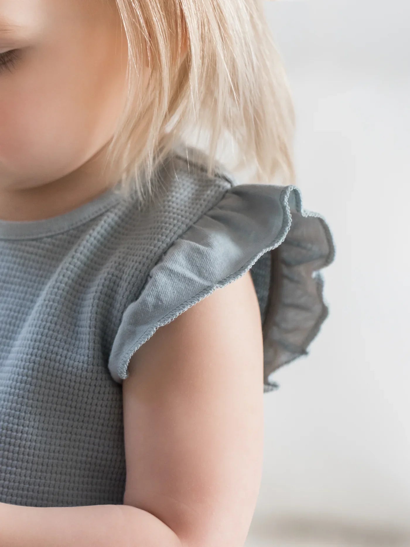 Our Maci Flutter Tank Romper is made from 100% organic waffled cotton, with eco-friendly coconut buttons and nickel-free snaps. The adorable flutter sleeve and neckline keyhole add the perfect touches to this one-piece!