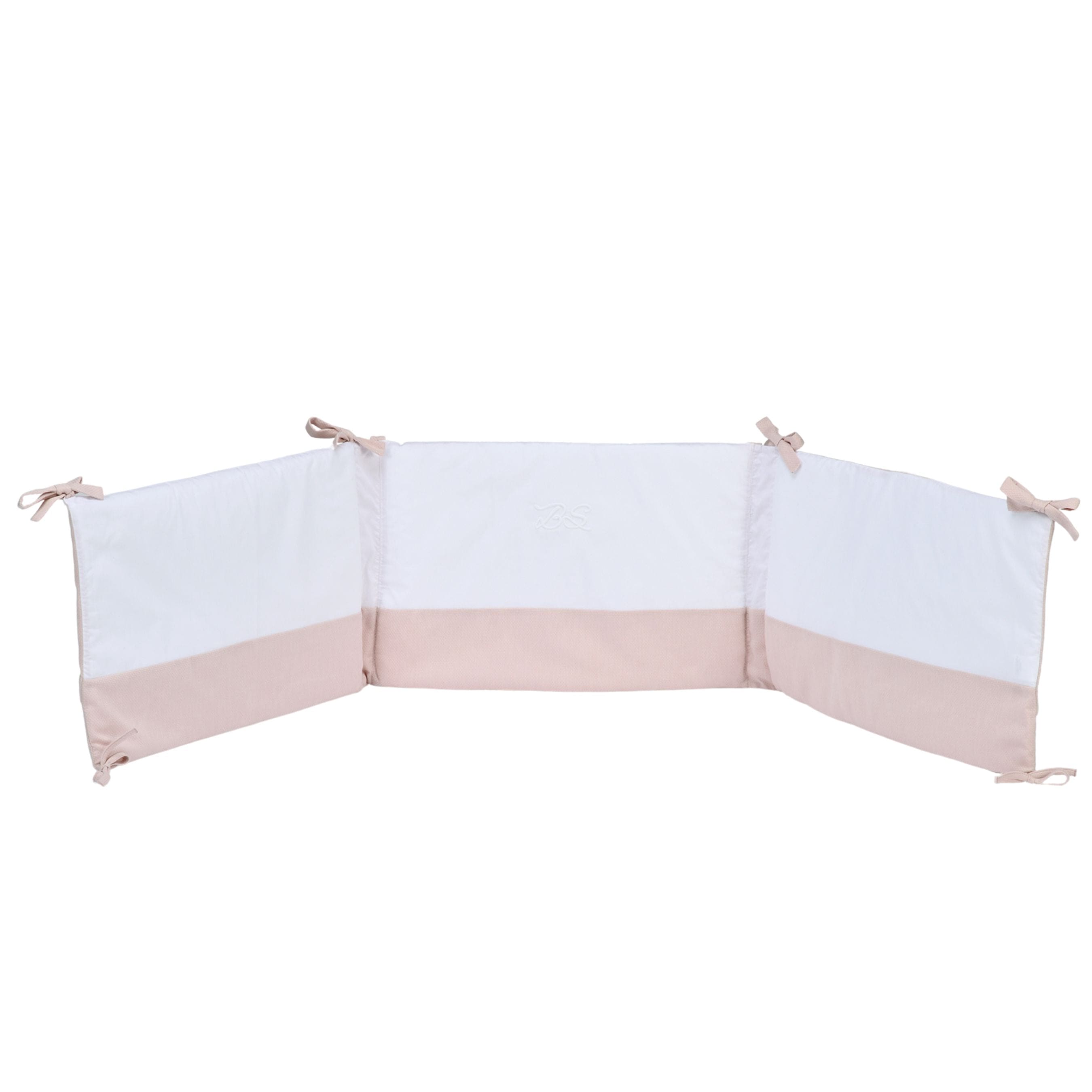 White & pink adjustable crib bumper, padded and made in soft cotton. Attaches to the bars with small knots, it has a white embroidery on the second panel.
