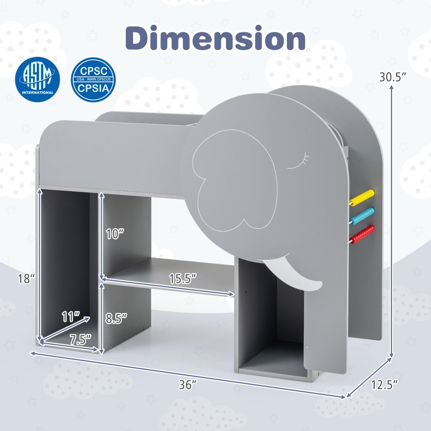 Color Gray Material MDF Overall Dimension 36" x 12.5" x 30.5" Weight Capacity of Each Shelf 22 lbs Suitable Age 3+ years old Net Weight 37.5 lbs Is Assembly Required Yes Box QTY 1(May vary by batch) Package Includes 1 x Kids Bookshelf 1 x User Guide