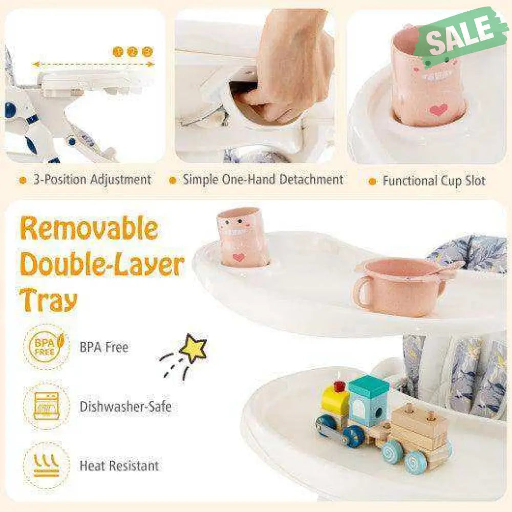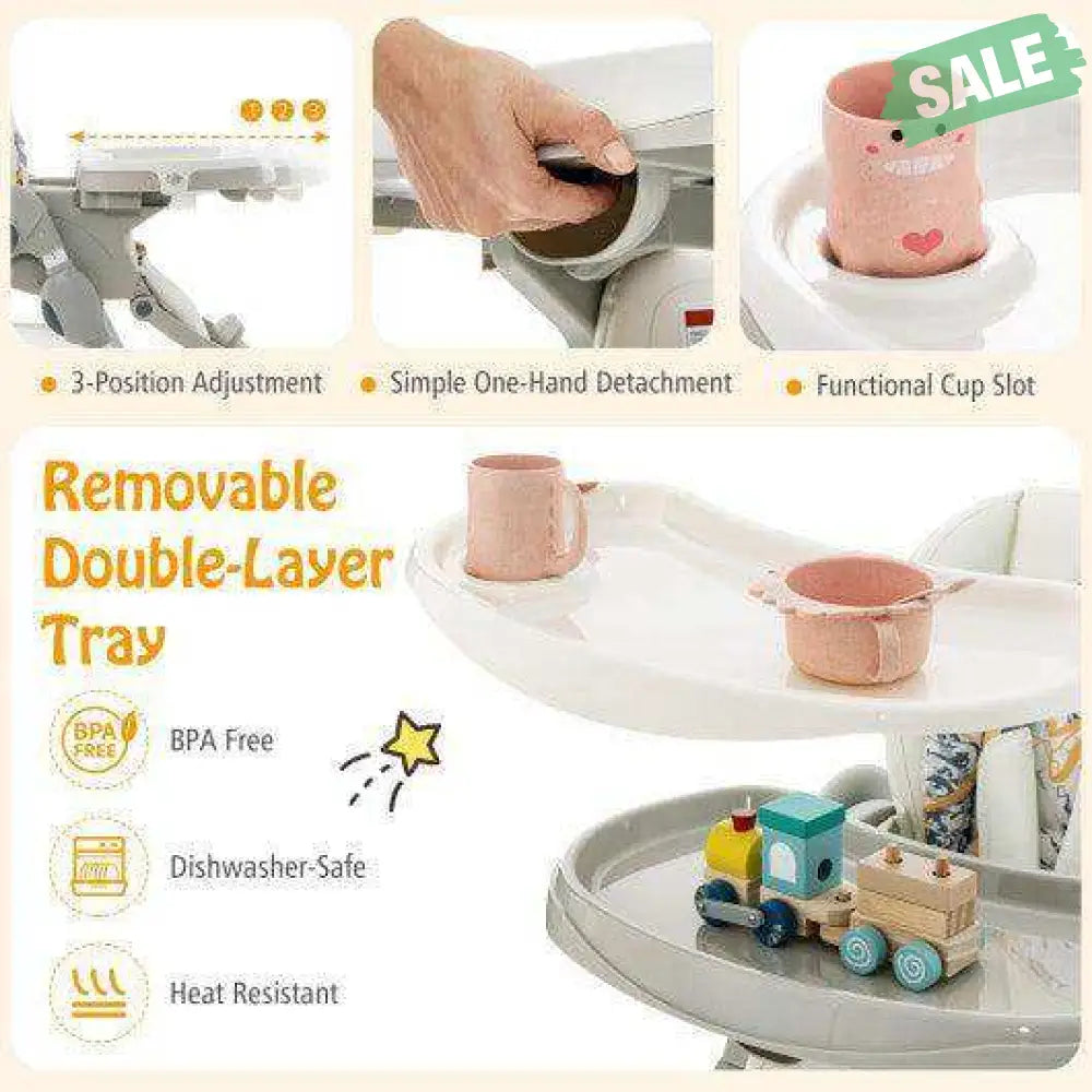 ● Tray for Meal and Play: The removable double-layer tray with 3-position adjustment and simple detachment creates a perfect space for toddlers to eat and play. And the tray is made of high-grade PP which is BPA free and heat resistant for safety and durability. And it's also dishwasher-safe saving your time and effort.
