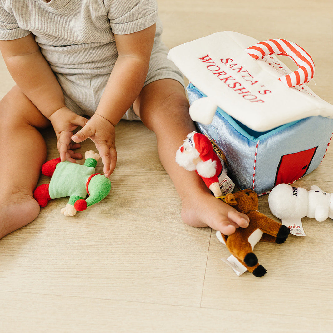 - Soft plush Santa's Workshop opens up to reveal 4 ct set of small plush, sensory and developmentally appropriate toys to keep baby entertained and curious