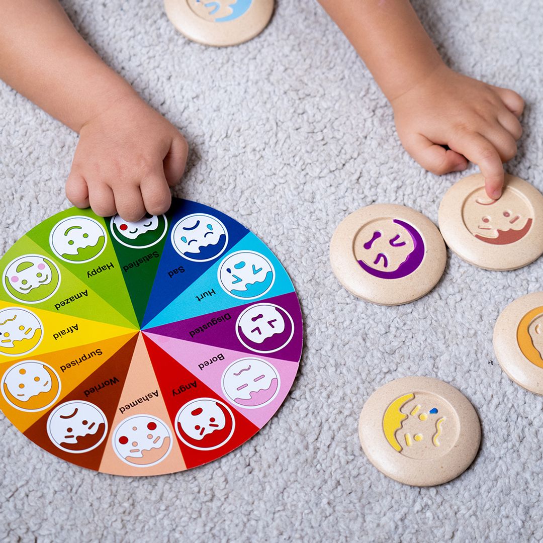 The set consists of 24 wooden tiles with 12 different emotions. Children can learn how to match two identical emotions with this fun memory game! Skills include learning about the relationship of colors and emotions. Emotion Color Wheel can help visually group feeling and practice emotion vocabulary.