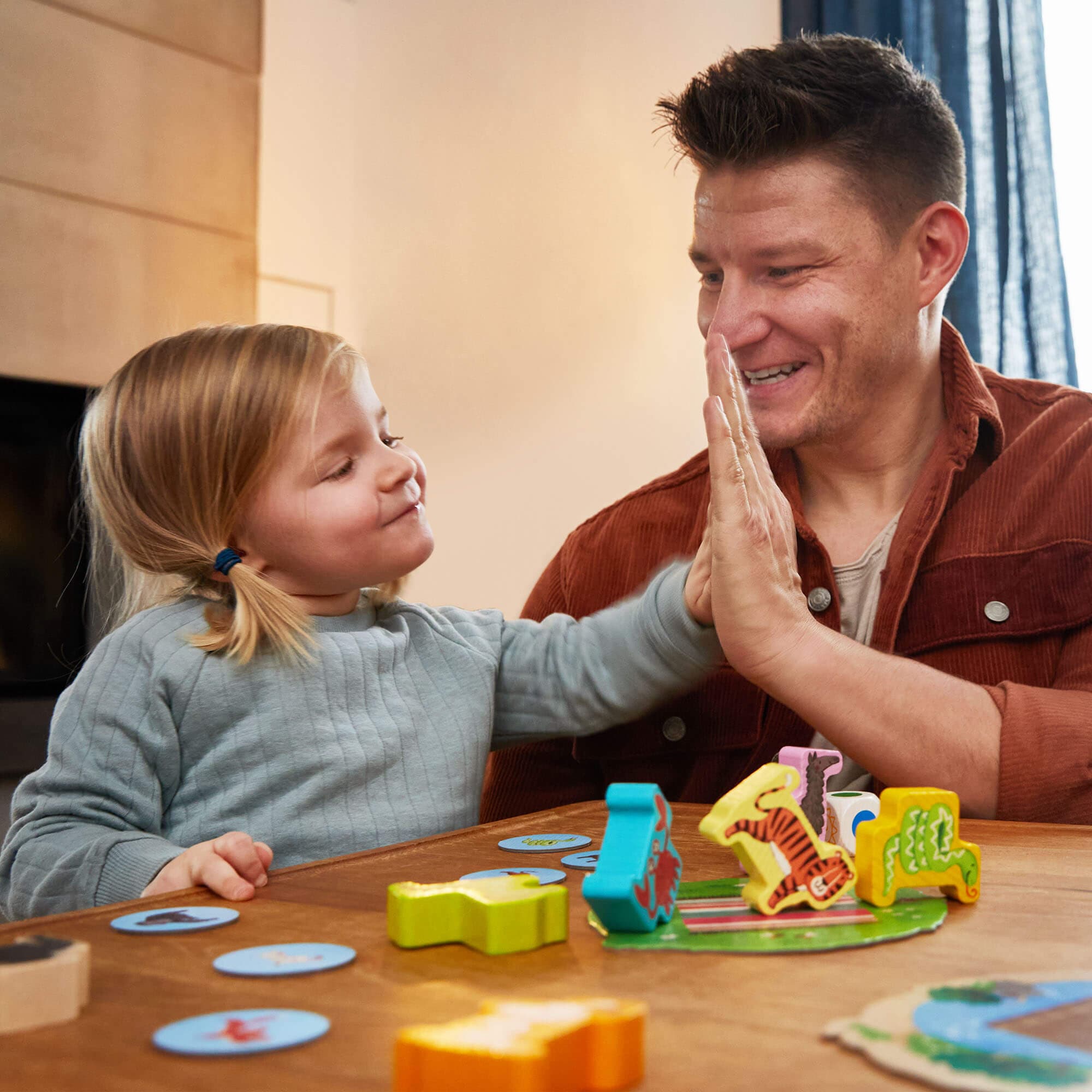 Things are getting wildly wobbly as the animals create a big stacking tower. Who will climb on whom? The die decides. But whether the animal stack stays standing or not is up to the players. They stack Animal upon Animal in three new games for young stackers. In the third game, they work cooperatively to race against the crab, training their dexterity skills with play. May the best stacker win!