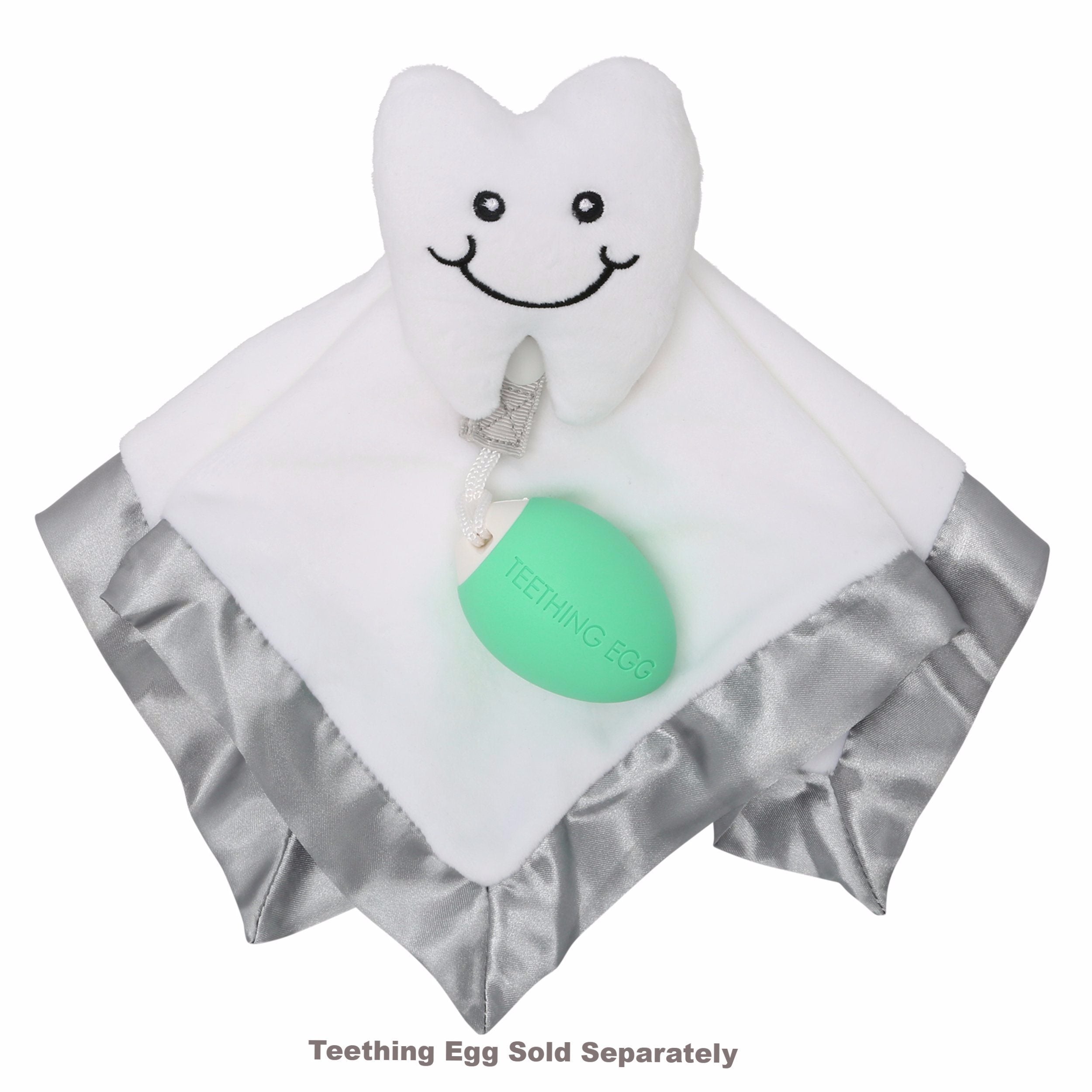 Our satin-trimmed security blanket is cuddly and super soft and made out of the softest plush material available. On top of the blanket is our Toby the Tooth plush to hold and cuddle (and teethe)!