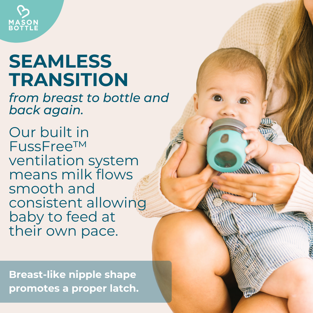 The Original Mason Bottle makes transitioning between breast and bottle a breeze for babies. Mason Bottle is also the most eco-friendly, parent-friendly, and budget-friendly glass baby bottle on the market.