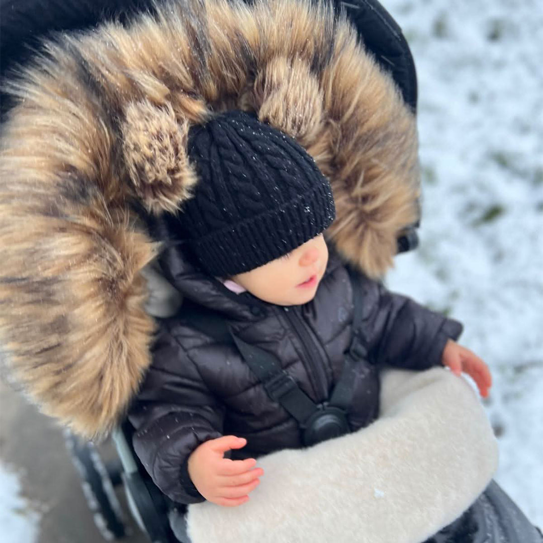 Cover Baby premium wool footmuff stroller sleeping bag with detachable fur, insulated with natural premium sheep wool. It grows with your child through two length adjustment options. Thanks to the longitudinal openings for safety belts, it fits both models with 5- and 3-point harness systems and models with combined straps holding the child. An additional advantage of this model is its lower extended part filled with a special protective waterproof fabric coating, allowing older children to ride in shoes. When transporting younger children, the extended bottom part of the footmuff becomes a stylish, functional, and fashionable stroller bag, which can easily attach to the stroller to carry necessary items like diapers and bottles or easily carried over the shoulder as a diaper bag.