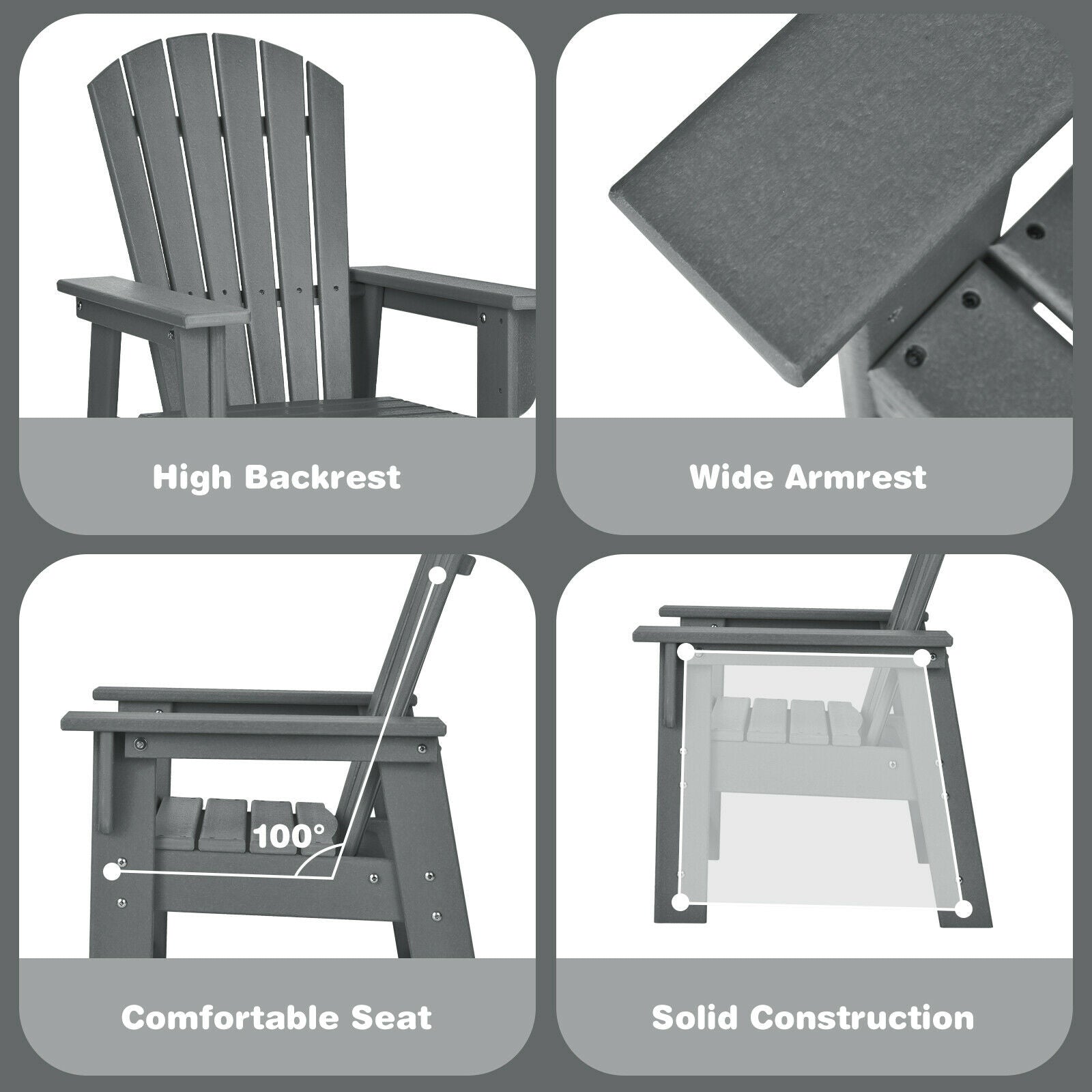 This comfortable Adirondack style chair is made to suit the size of a child which can be used indoors and outdoor to accompany your children for years of use.  This Adirondack chair with ergonomic design offers a comfortable sitting experience. With ASTM CPSIA and CPC certification you can use this kidsâ Adirondack chair without worry. Besides the premium material is odorless and easy to maintain which greatly saves your precious time. Equipped with clear instructions and all hardware you can complete the installation quickly. Give your little one a place to sit back and relax!  If you are looking for such a chair for your kids do not hesitate to take it to your home!  The weather-resistant material will not easy to peel or crack Sturdy construction offers strong support to hold up to 165lbs Spacious seat with 100° elevation design ensures comfort Ergonomic backrest and armrest for ultimate relaxation The wood-like surface adds a sense of nature to your home Blends well with any home decoration and furniture style Suitable for the patio backyard garden poolside and so on Equipped with ASTM CPSIA and CPC certification Available for kids from 3 to 8 years old Smooth surface for easy maintenance Clear instruction for easy installation