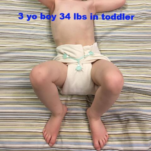 - Toddler size 2 (30x30) works great if your baby is over 30 lbs, 20" in the waist, or needs a longer rise than the regular toddler provides.