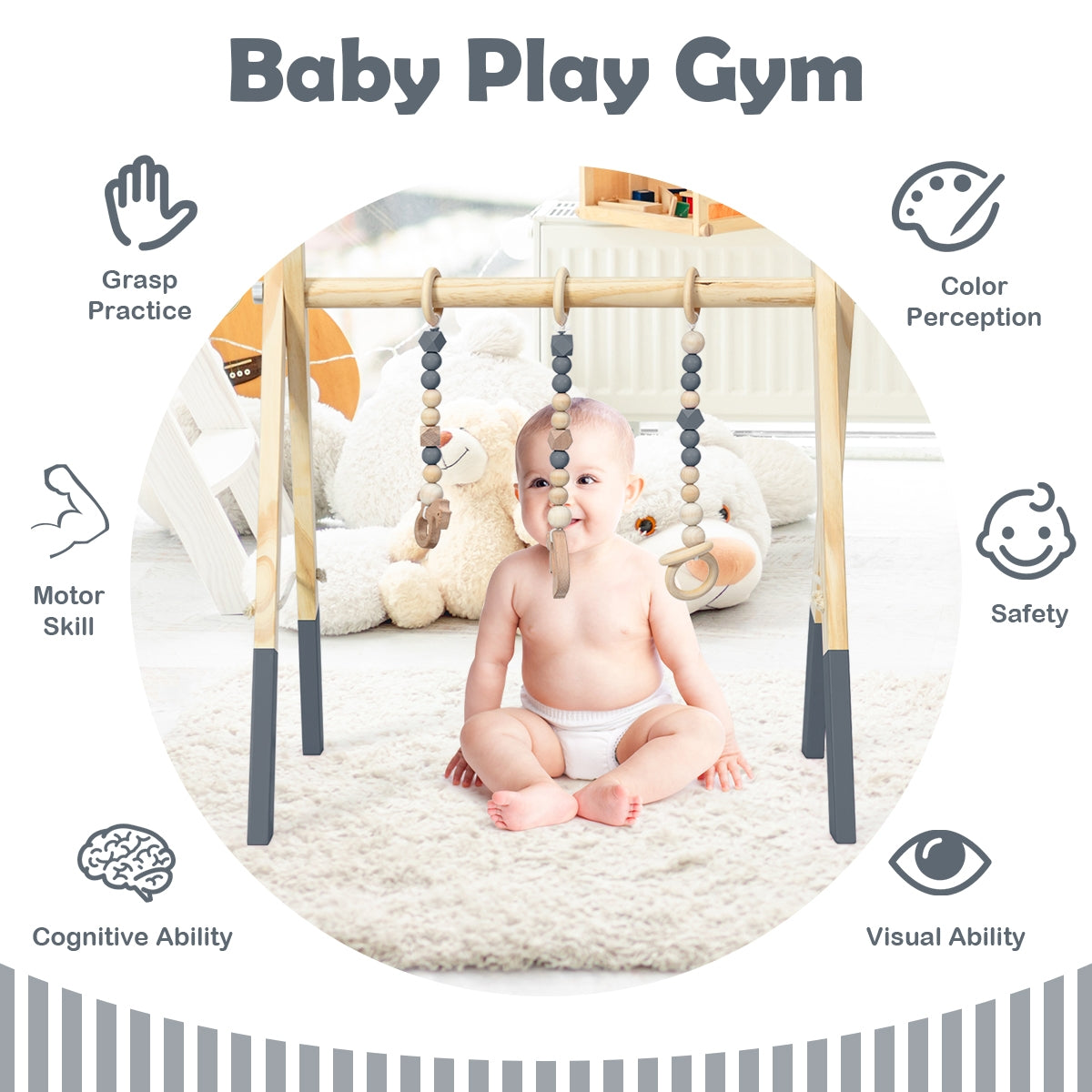 The play gym is made of 100% environmental material. You may rest assured the health of baby. Â Infancy is the significant stage of intellectual development. Their little brains are thirsty for new knowledge and the simple patterns would be the most suitable thing. This play gym will not only exercise babyâs body but also mental ability. When not in use it can easily be disassembled in one minute and stored in small corner. Â Do not miss the best gift for your child! Â Natural wood and environmental material guarantee health Toys with cute shape and pattern especially designed for babies Promote both babyâs physique and mental ability in infancy Triangle design connected with thick rope ensures stability Foldable design provides convenience to store in narrow space Easy to assemble and disassemble with simple construction Perfect choice as a newborn gift for close friends and confidante