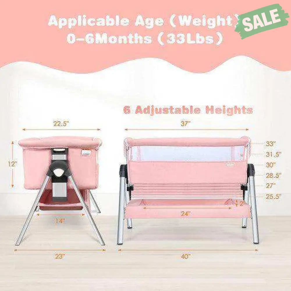 ‚óè 6 Adjustable Heights: The height of this baby bedside bassinet is adjustable which can be easily adjusted by pressing the button on either side of the bed. The 6 adjustable heights make the crib suitable for most adult beds. The tilting angle design can make angle of the bassinet adjustable which can effectively prevent the risk brought by the baby spit milk and better accompany the baby to grow up.