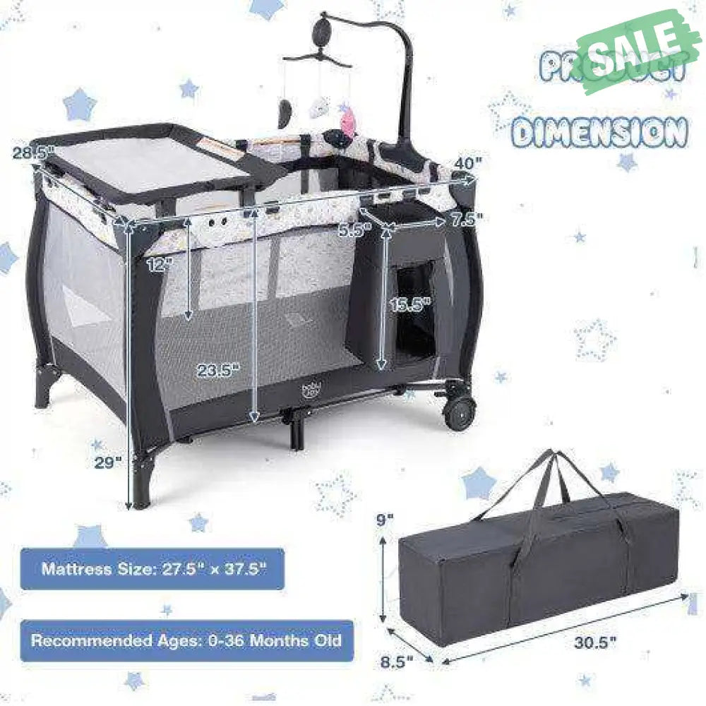 -Package includs 1 Basic Baby Playard 1 Diaper Changing Table 1 Canopy with Net 3 Hanging Toys 1 Mattress 1 Storage Bag 1 Music Box 1 Carry Bag and Instruction