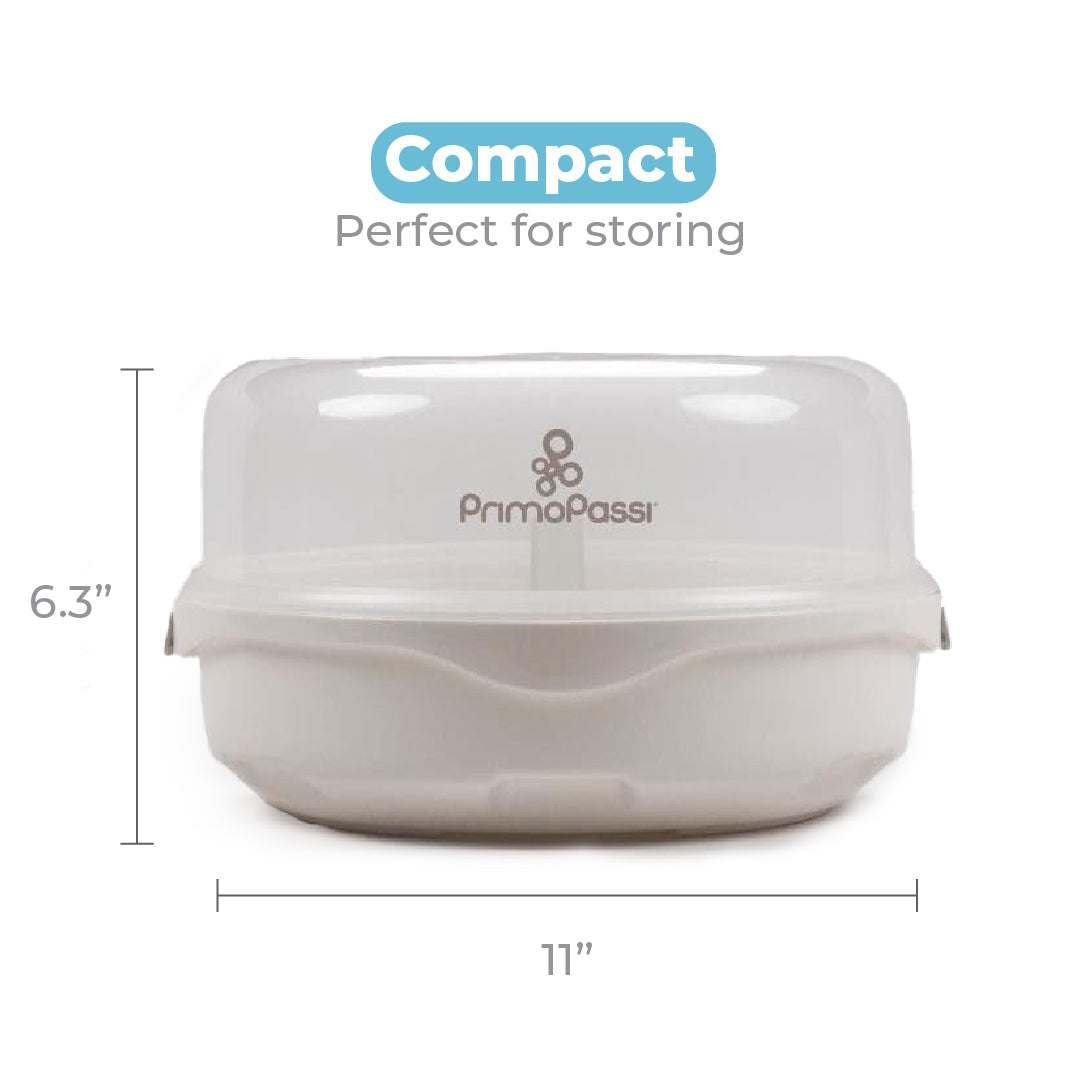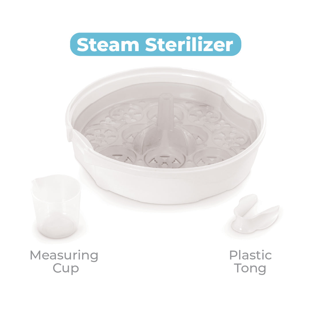 This time efficient product was designed to promote fast sterilization of wide neck or standard feeding bottles, pacifiers, breast pump parts, sippy cups, trainer cups, teethers and more!