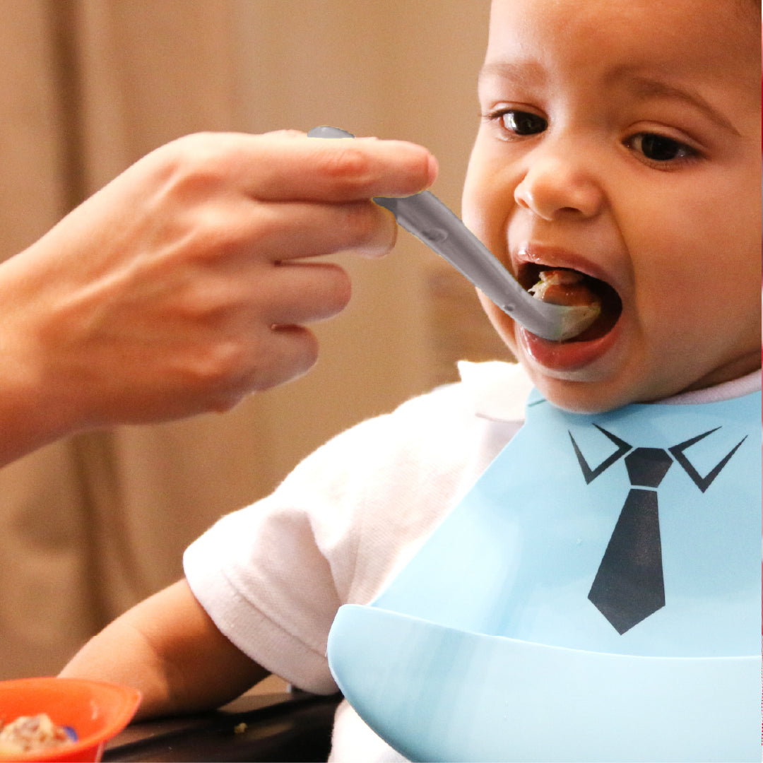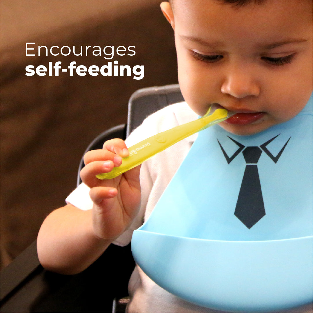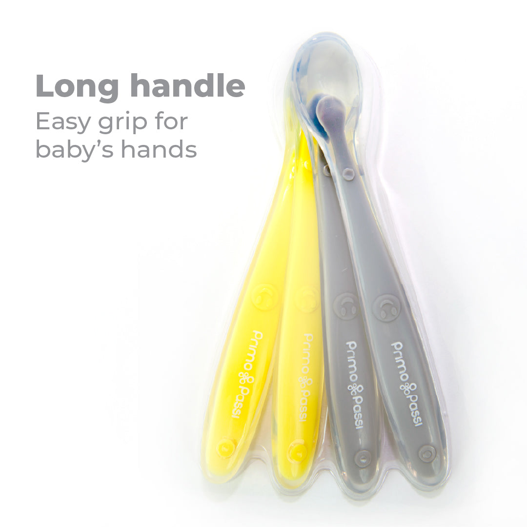 The Primo Passi Silicone Spoon - 4PK, Grey and Yellow is designed to promote independency and safety for babies who are being introduced to solid foods. The long and ergonomic handle is also friendly to adult's hands so parents can comfortably feed their little ones. They're comfortable to hold, and just the right length to reach the bottom of most baby food jars. Soft and Flexible! It was designed with a round shape with ultra soft food grade silicone, gentle enough for baby's sensitive gums.