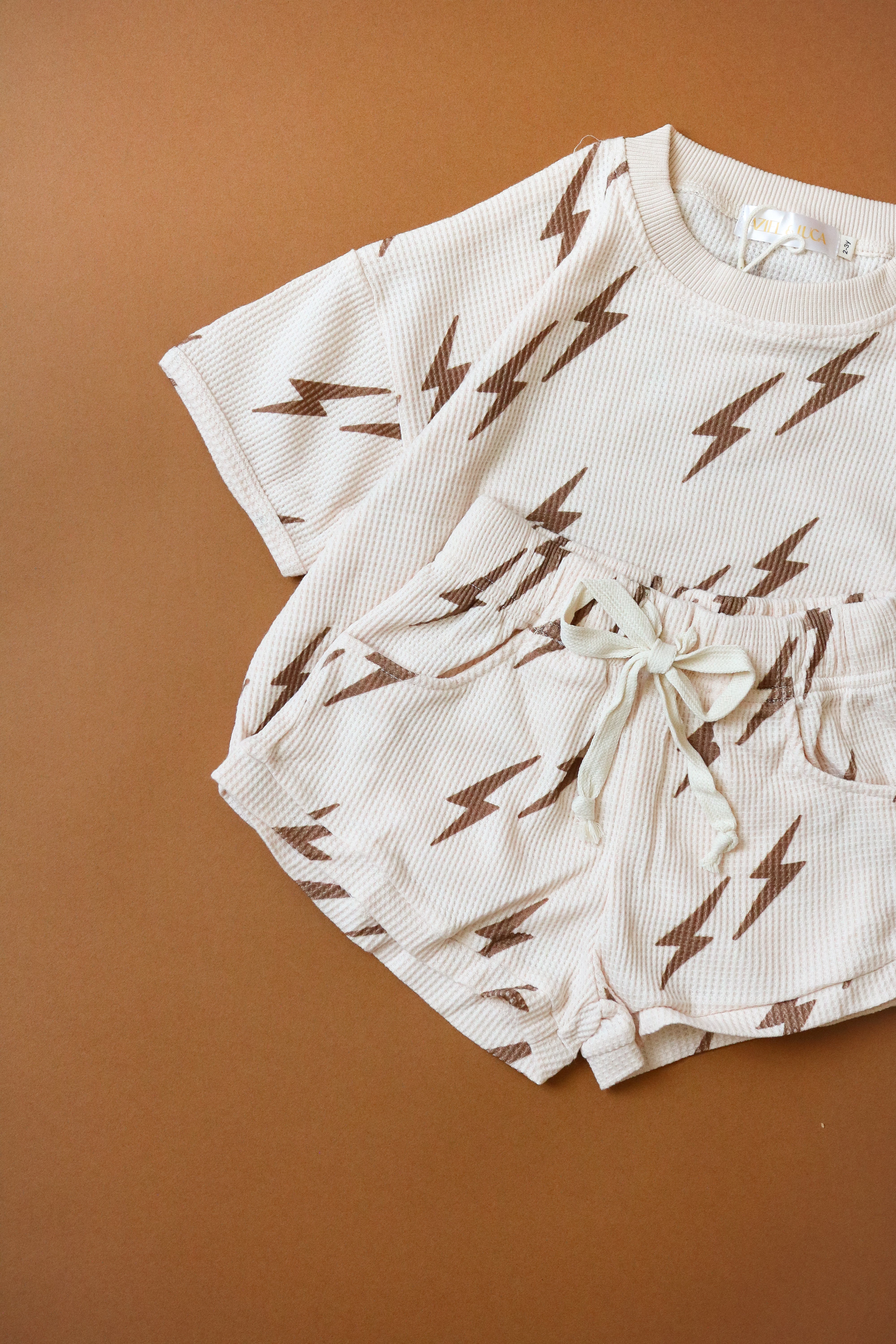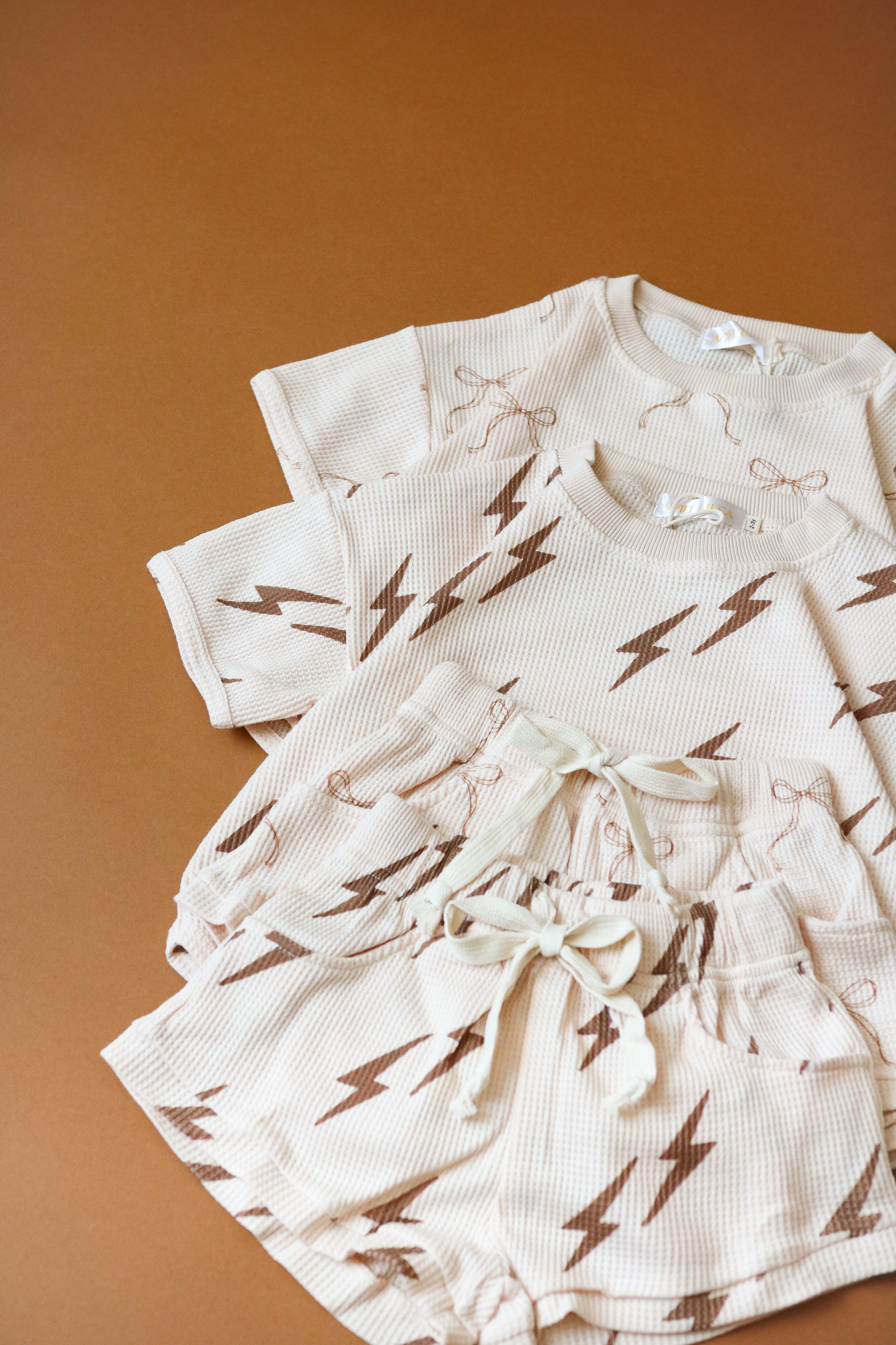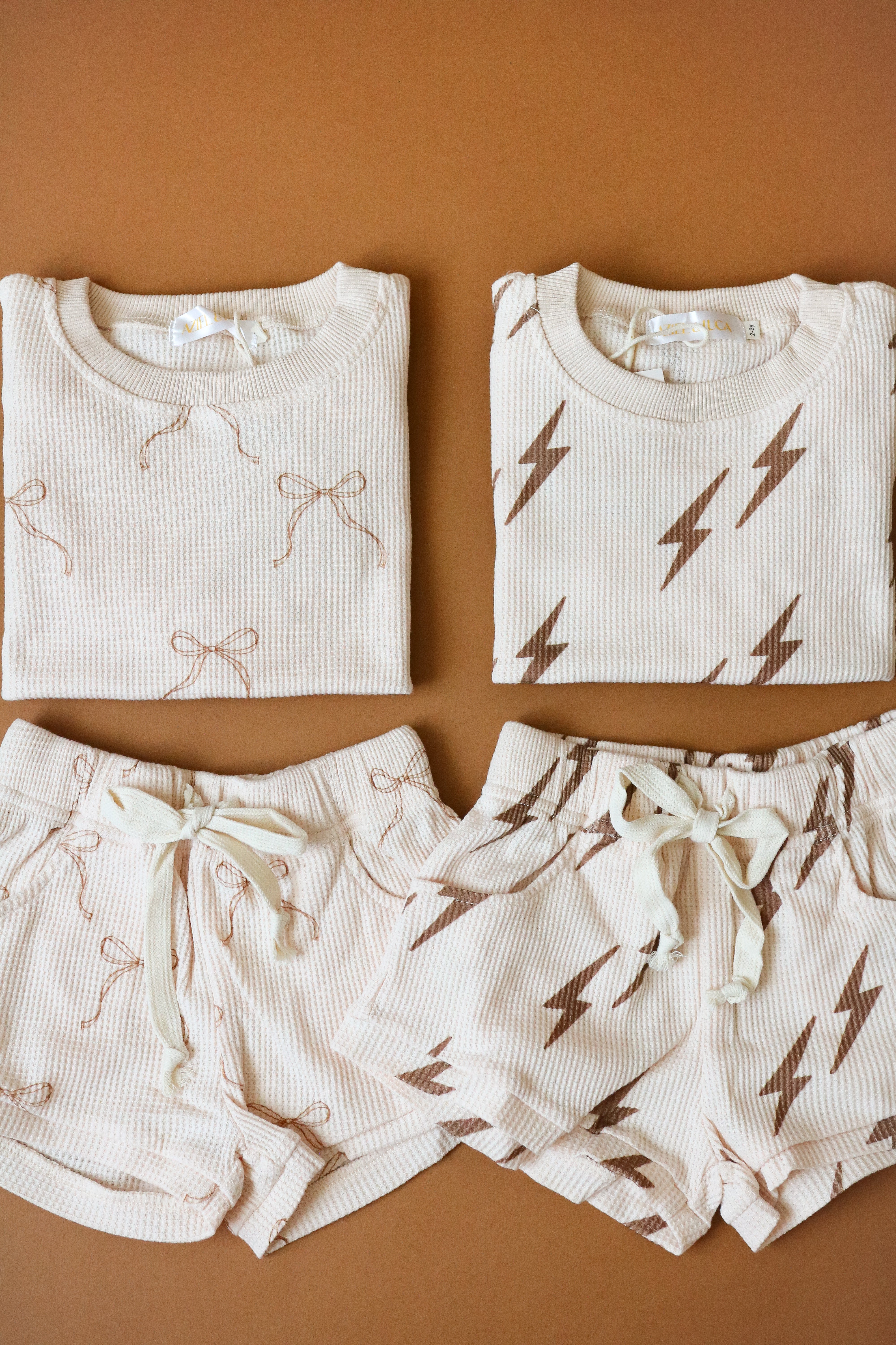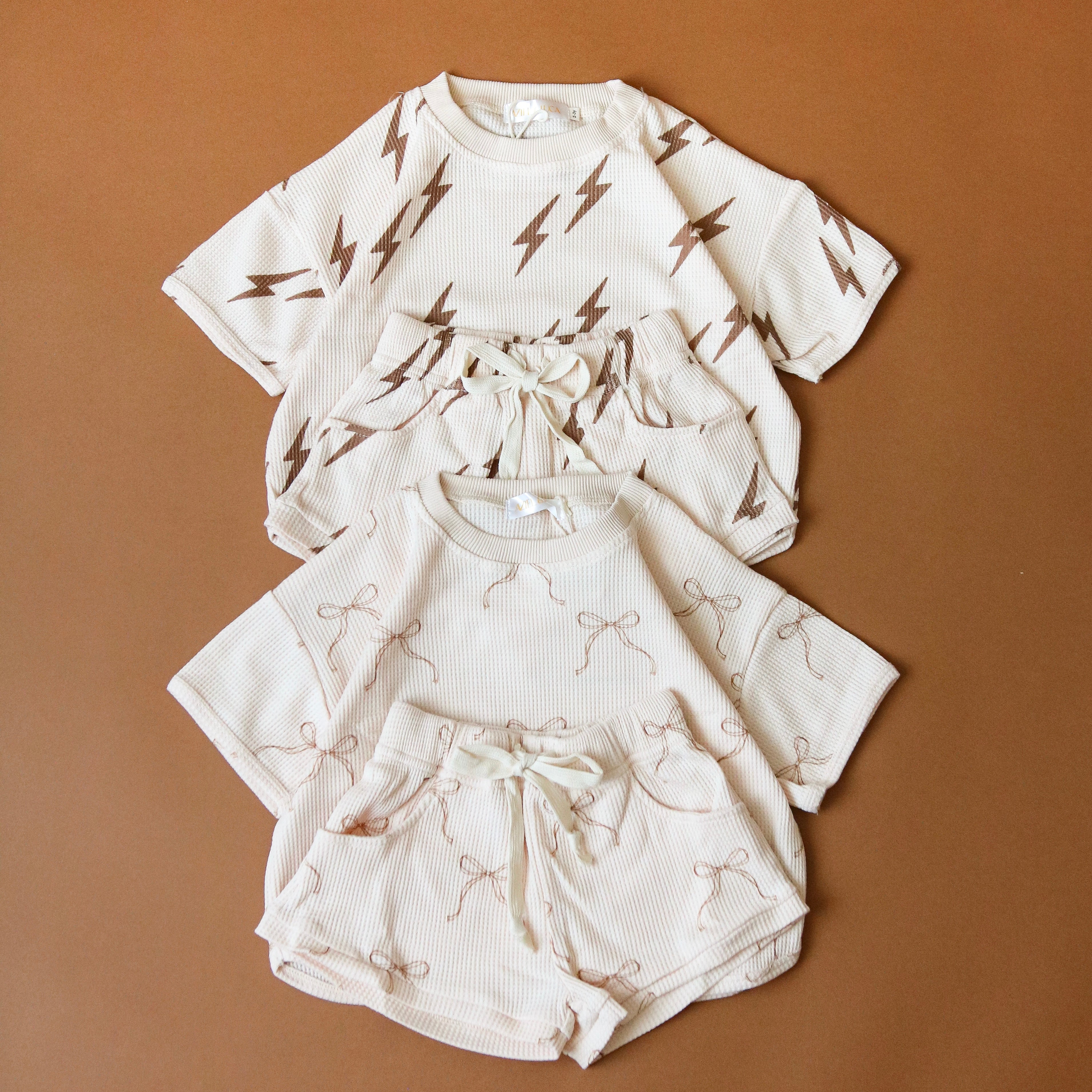 Our waffle Set features a neutral design that's sure to make them stand out in a crowd. The bolts and bows print make it the perfect choice for a summer of adventure and exploration.
