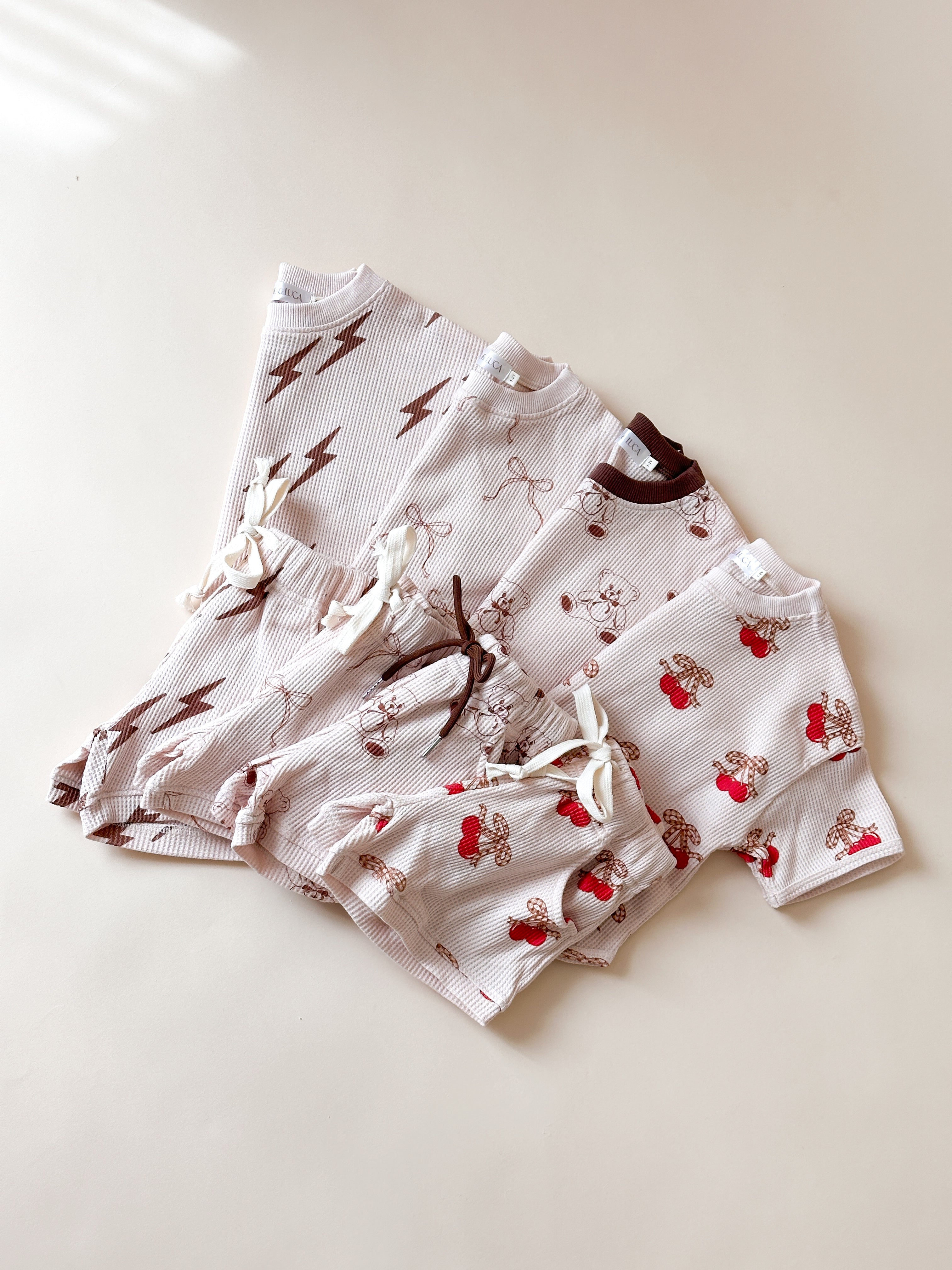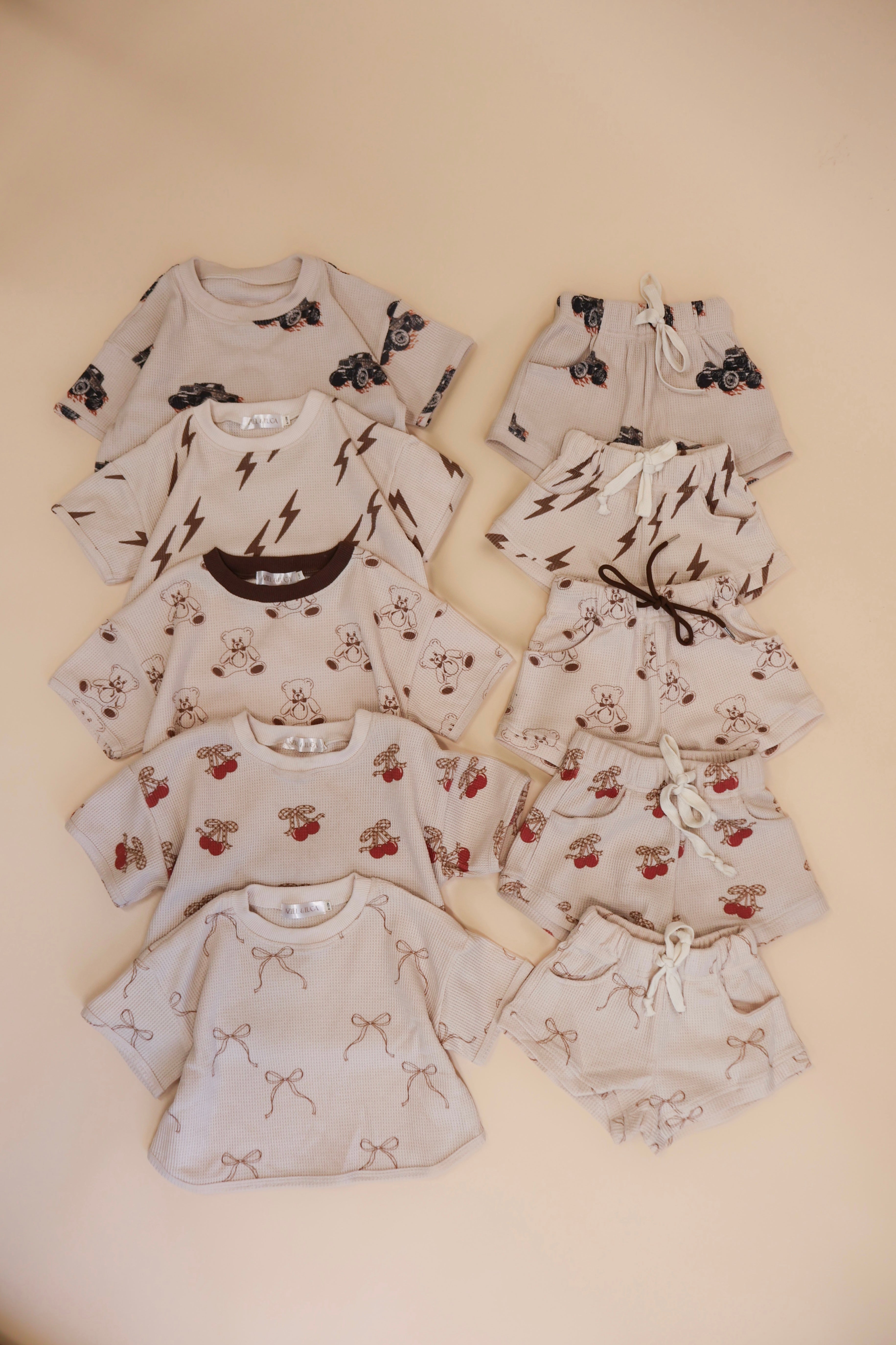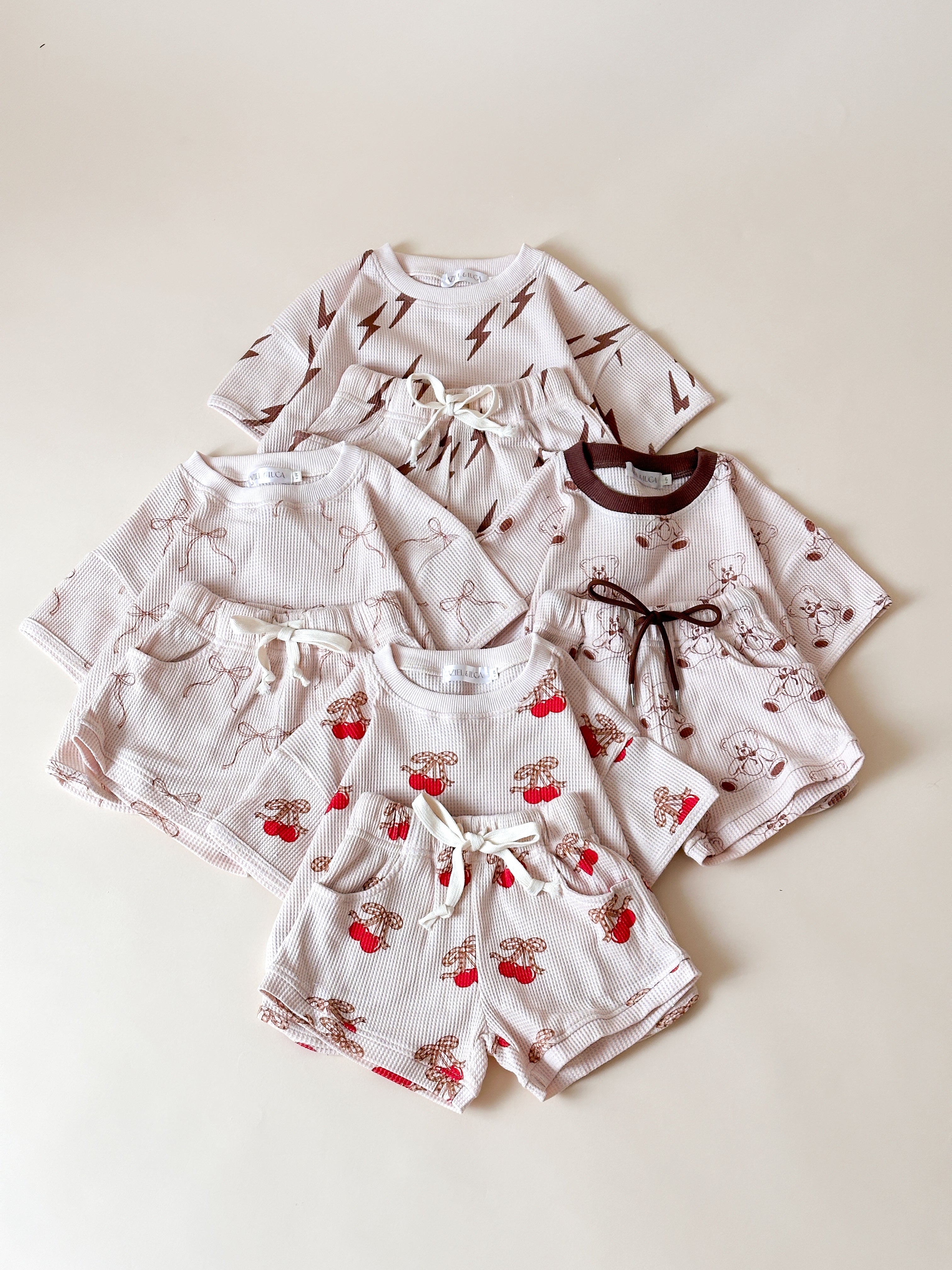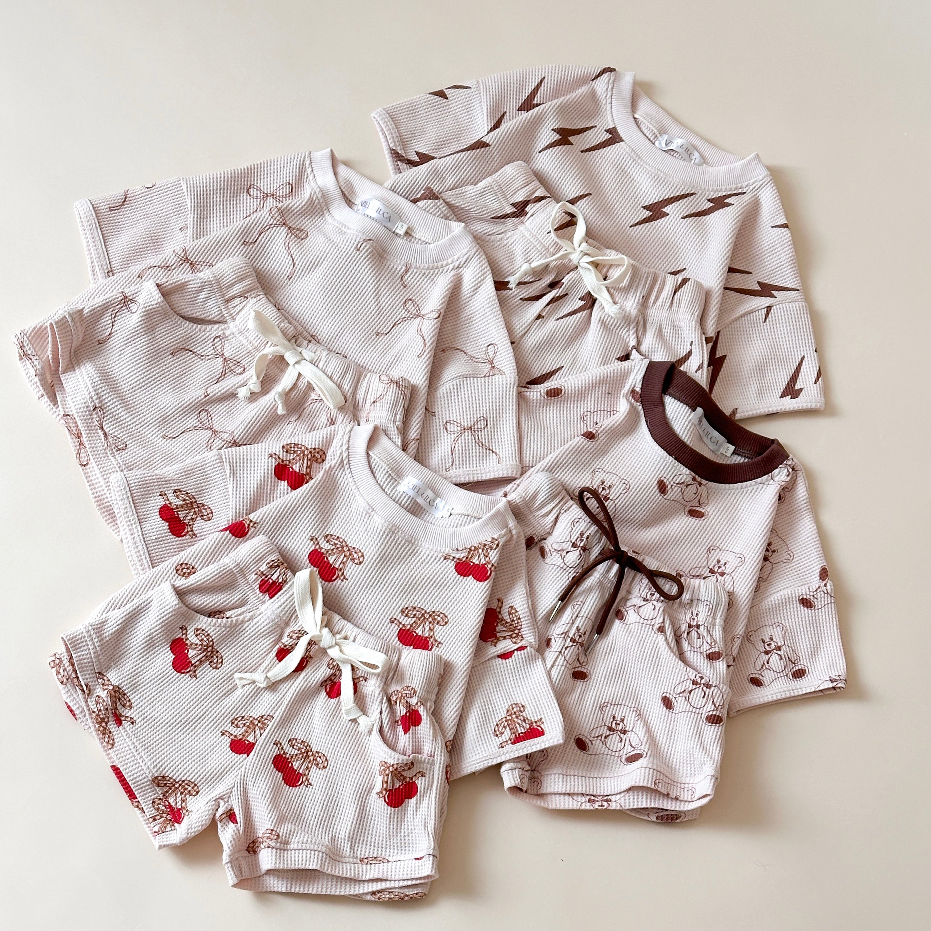 Get ready to add a dash of fun and whimsy to your little one's wardrobe with our adorable Bolt, Bow, Cherry and Bear Print Baby Waffle Sets! Made from our signature soft and cozy waffle material, these sets are perfect for the warm summer months ahead.