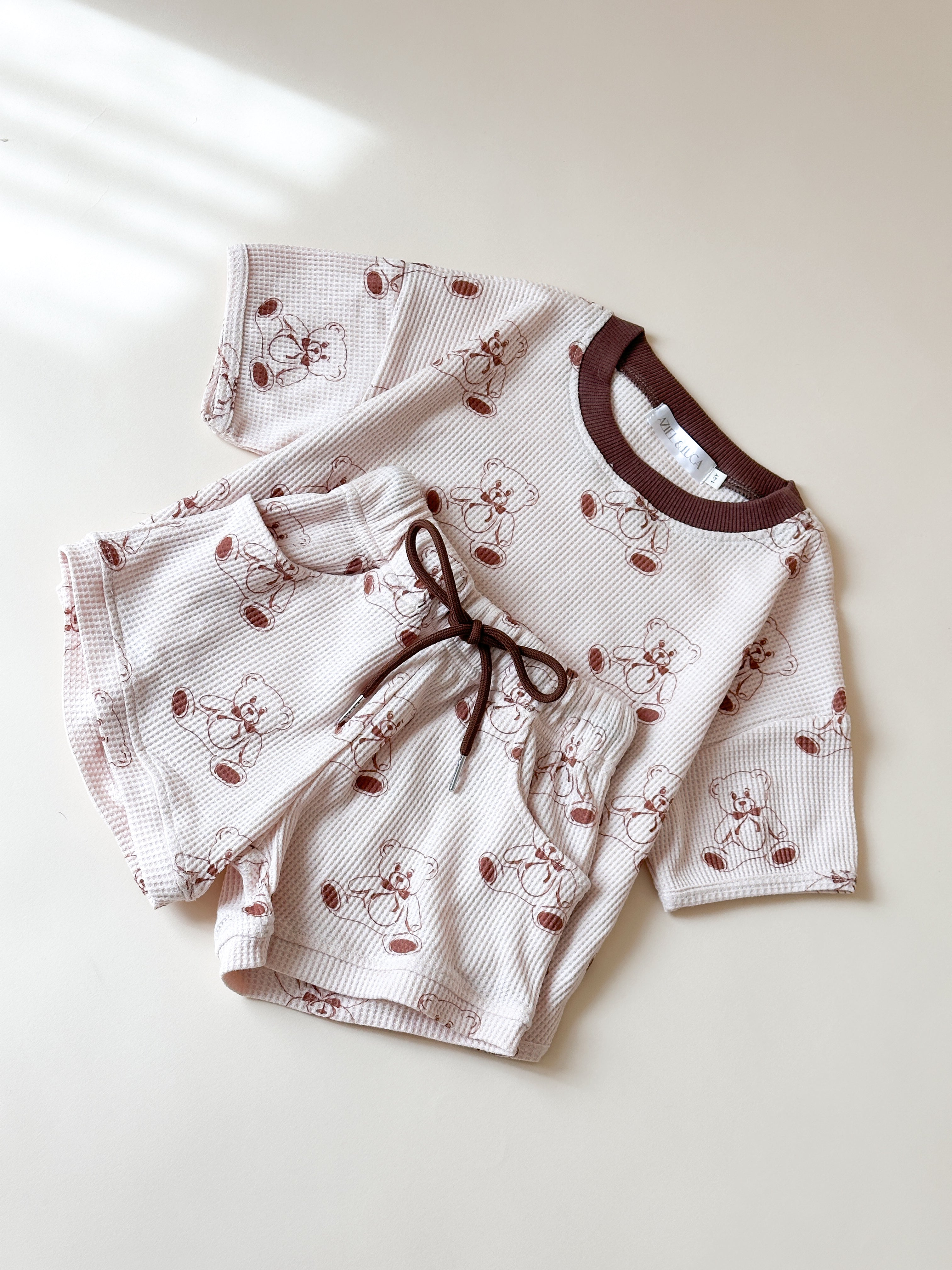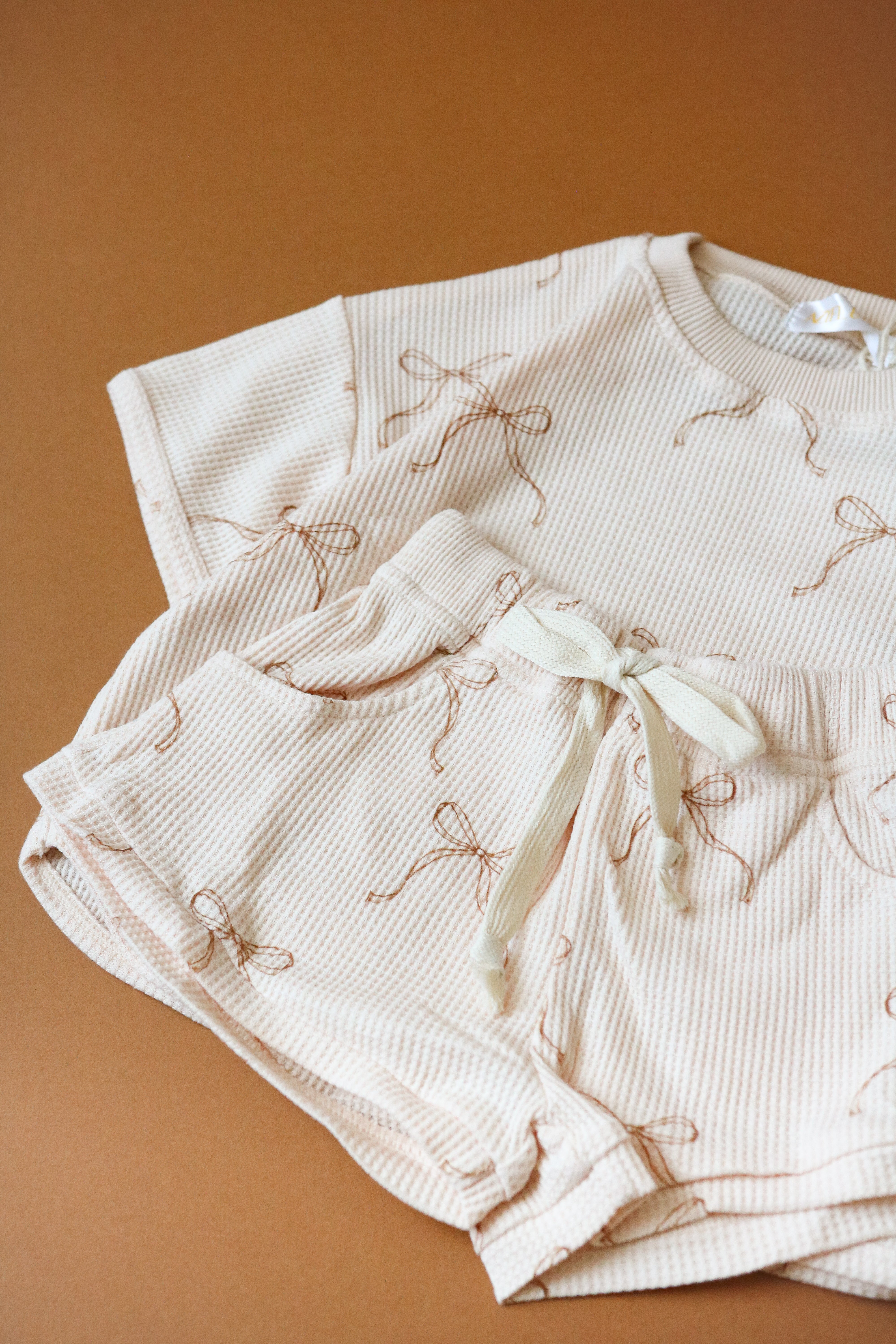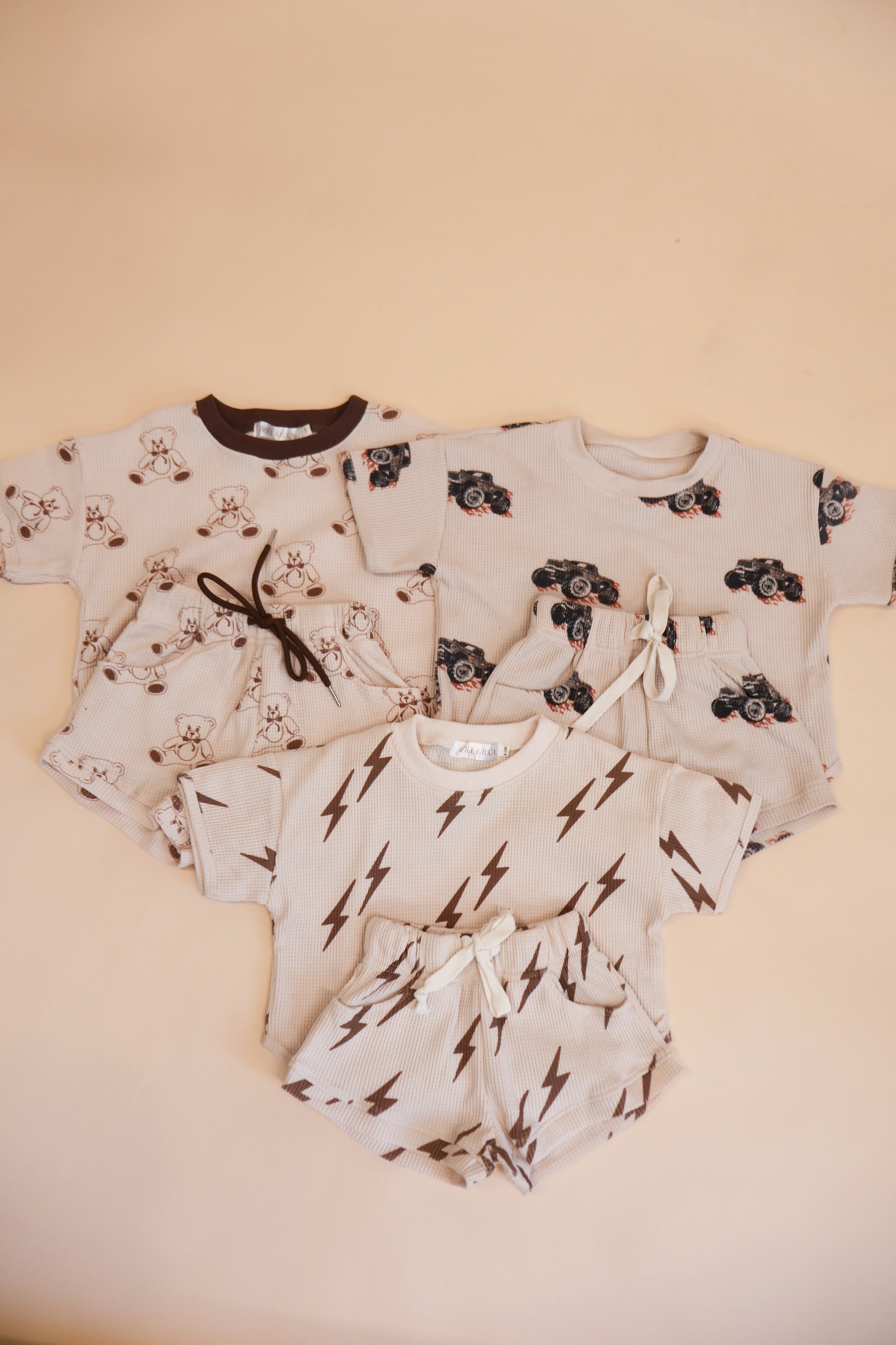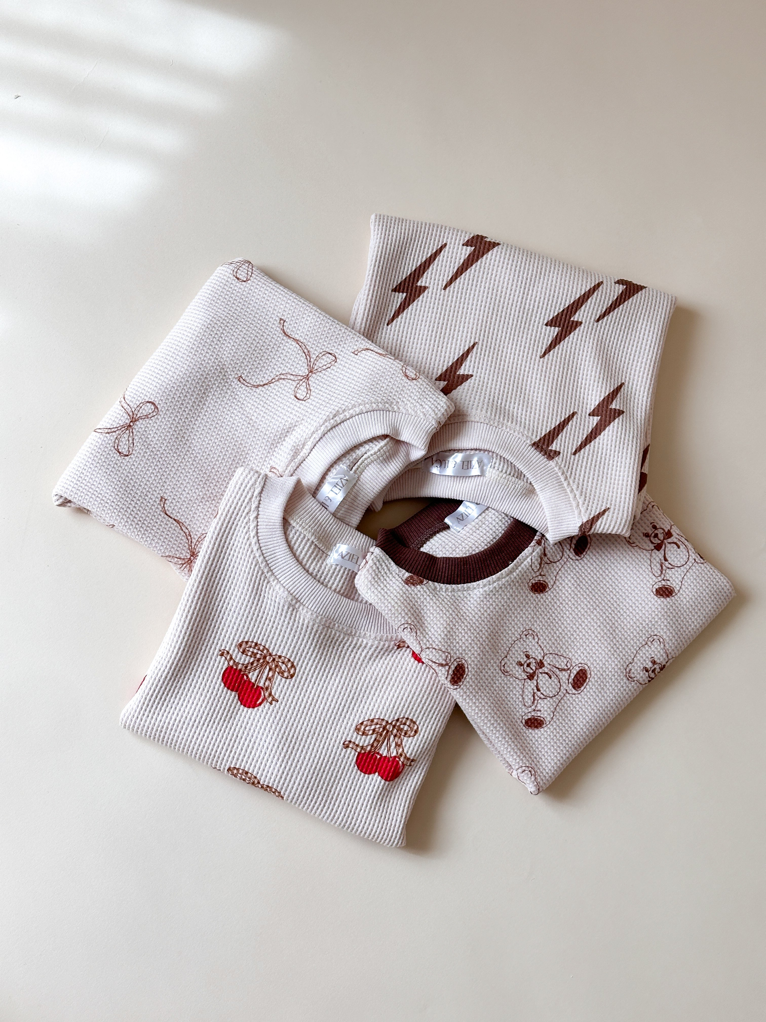 Get ready to add a dash of fun and whimsy to your little one's wardrobe with our adorable Bolt, Bow, Cherry and Bear Print Baby Waffle Sets! Made from our signature soft and cozy waffle material, these sets are perfect for the warm summer months ahead.