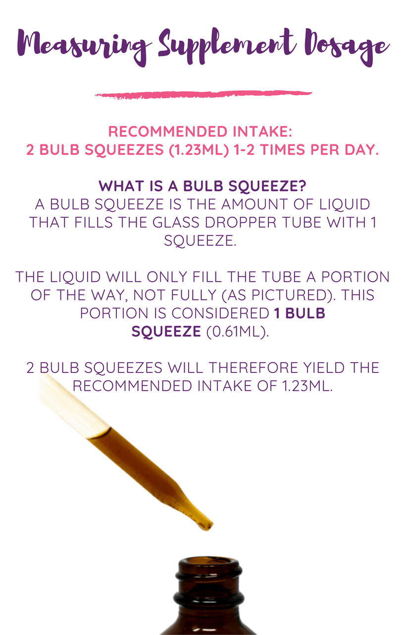 Recommended Intake: 2 Bulb Squeezes (1.23mL) 1-2 times per day directly under your tongue or mixed in a beverage.