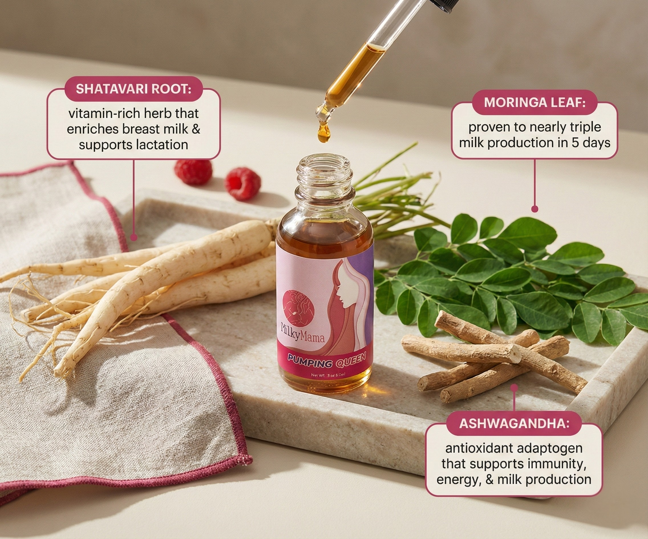 Pumping Queen® was designed to promote healthy lactation, increase milk production, and enrich breast milk with a special blend of organic herbs. Being considered among the best lactation supplements, it includes Shatavari Root which is a vitamin rich herb that helps enrich milk and increase milk production; Moringa Leaf is a nutritional powerhouse that helps increase milk production and enrich milk; and Ashwagandha is a powerful, ayurvedic herb that is rich in antioxidants, supports immune function, increases energy and increases milk production.