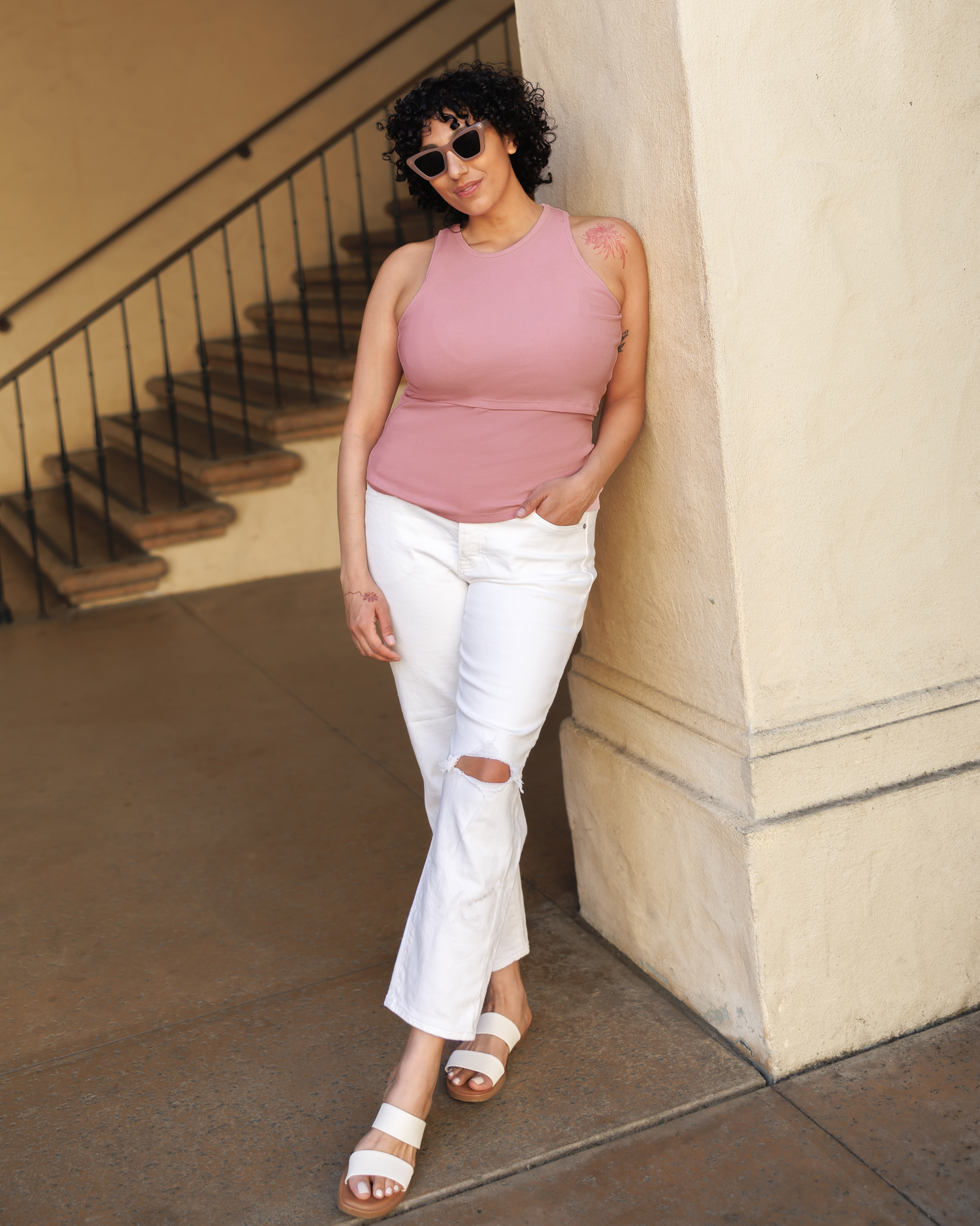 A new take on a functional nursing tank. Whether you’re going sporty or sexy, this versatile nursing tank top is a must in any new mom’s breastfeeding wardrobe. Perfect for mixing and matching, dressing up or dressing down, this on-trend nursing top features a flattering racerback cut with a high neckline and a close fit. The discreet feeding panel lifts to reveal a V-shaped inner layer for pull-aside nursing, providing easy access for your baby on one side and great coverage on the other side. Plus, the premium ribbed jersey fabric is breathable, super soft, and moisture wicking, with a four-way stretch to accommodate your changing body.