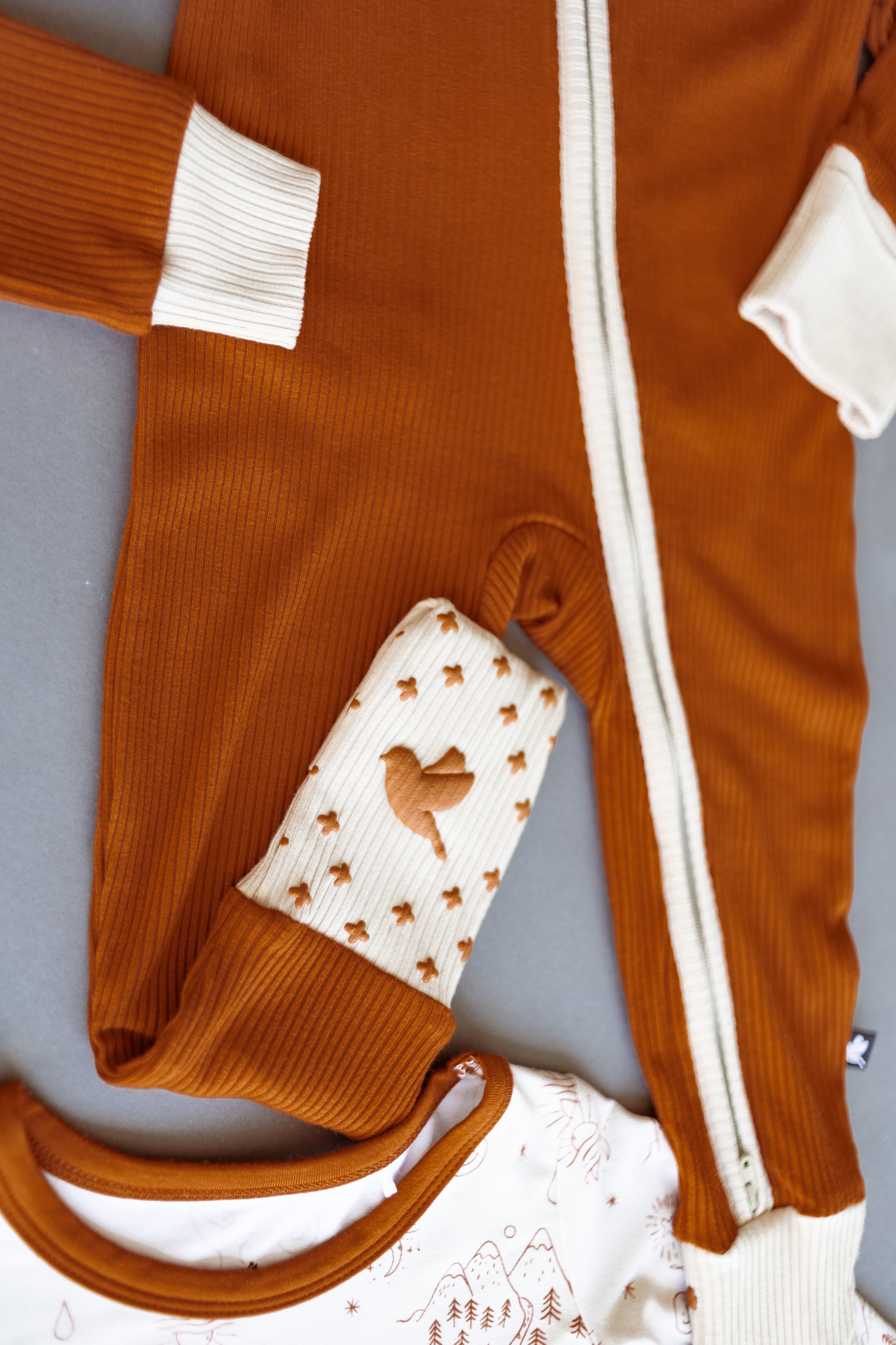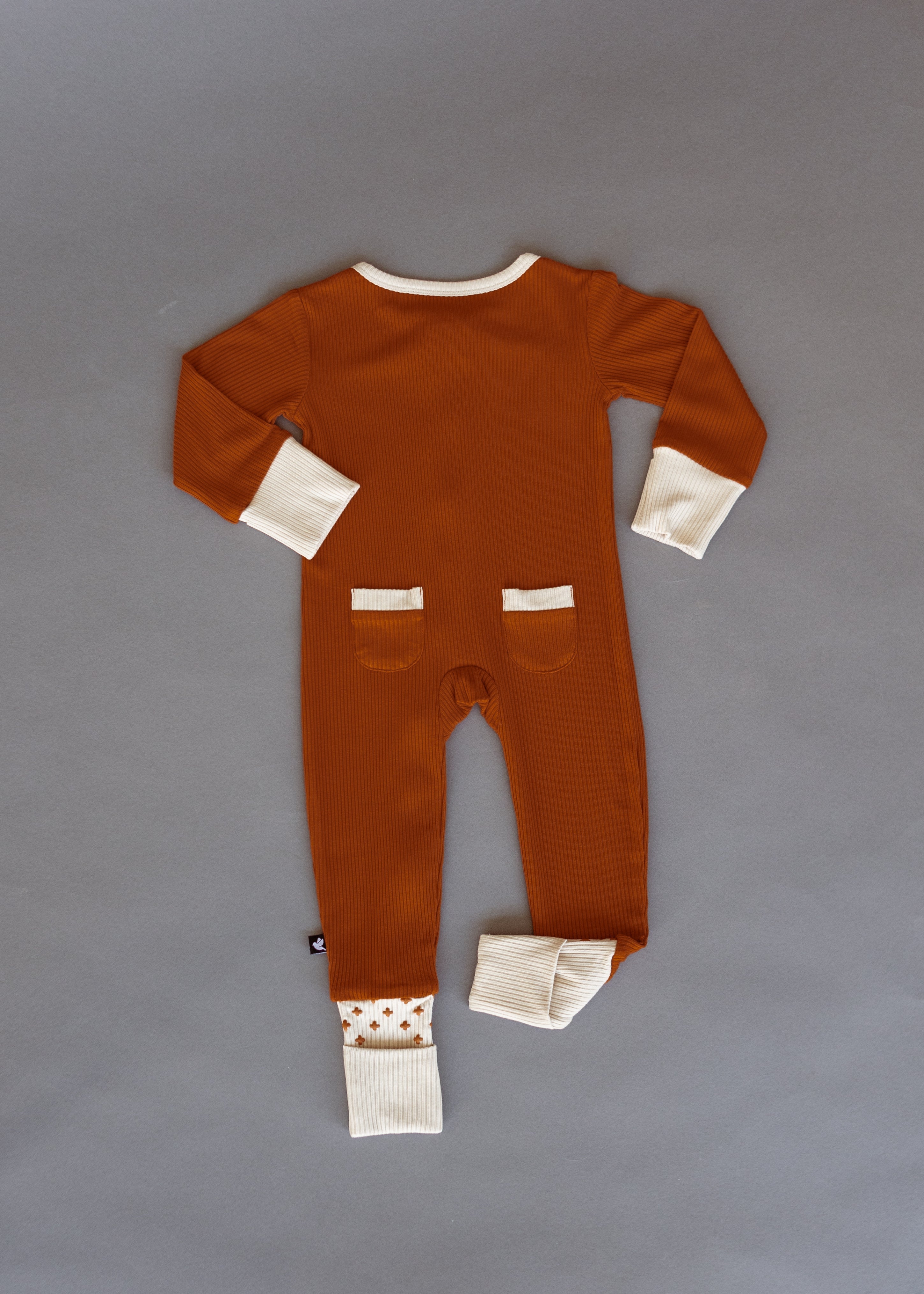 The Rust Rib Pajama Romper is a cozy and stylish addition to your baby’s sleepwear collection. With its ultra-soft fabric and cute design, it's perfect for those restful nights and relaxing days. Shop now and give your baby the gift of comfort and style during their downtime!
