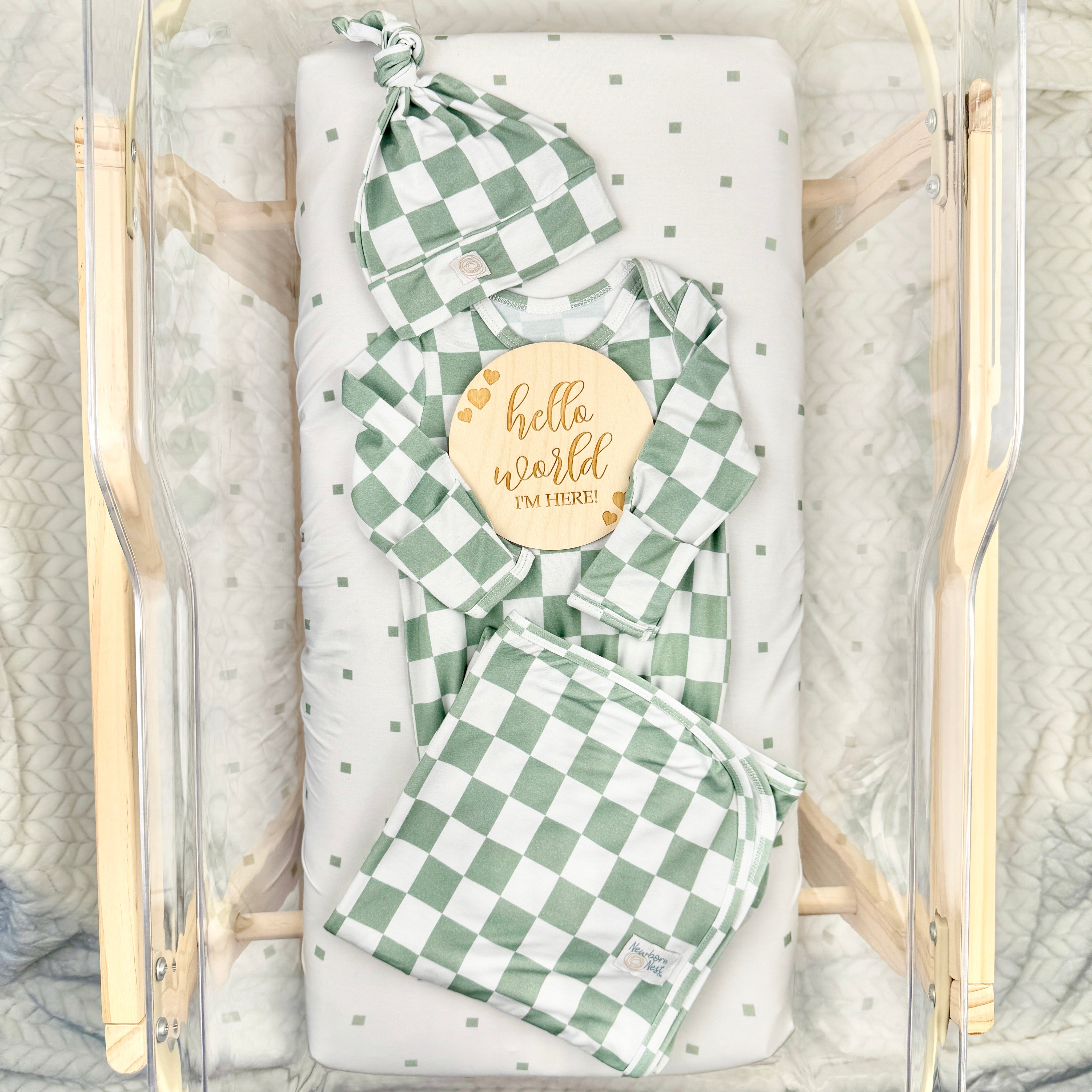 The first fabrics you wrap your baby in are important! Unlike the clothes your baby will get in the hospital, our Snuggle Bamboo Newborn Nests are made with soft, stretchy, breathable fabric. They include everything your baby will need for their hospital stay PLUS you'll have the most adorable "Hello World" first photos!
