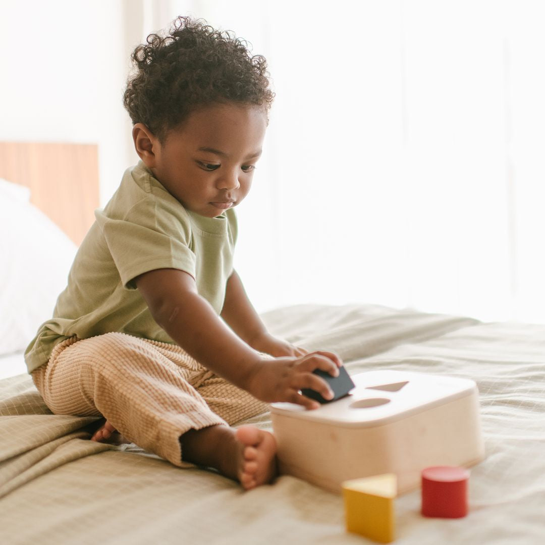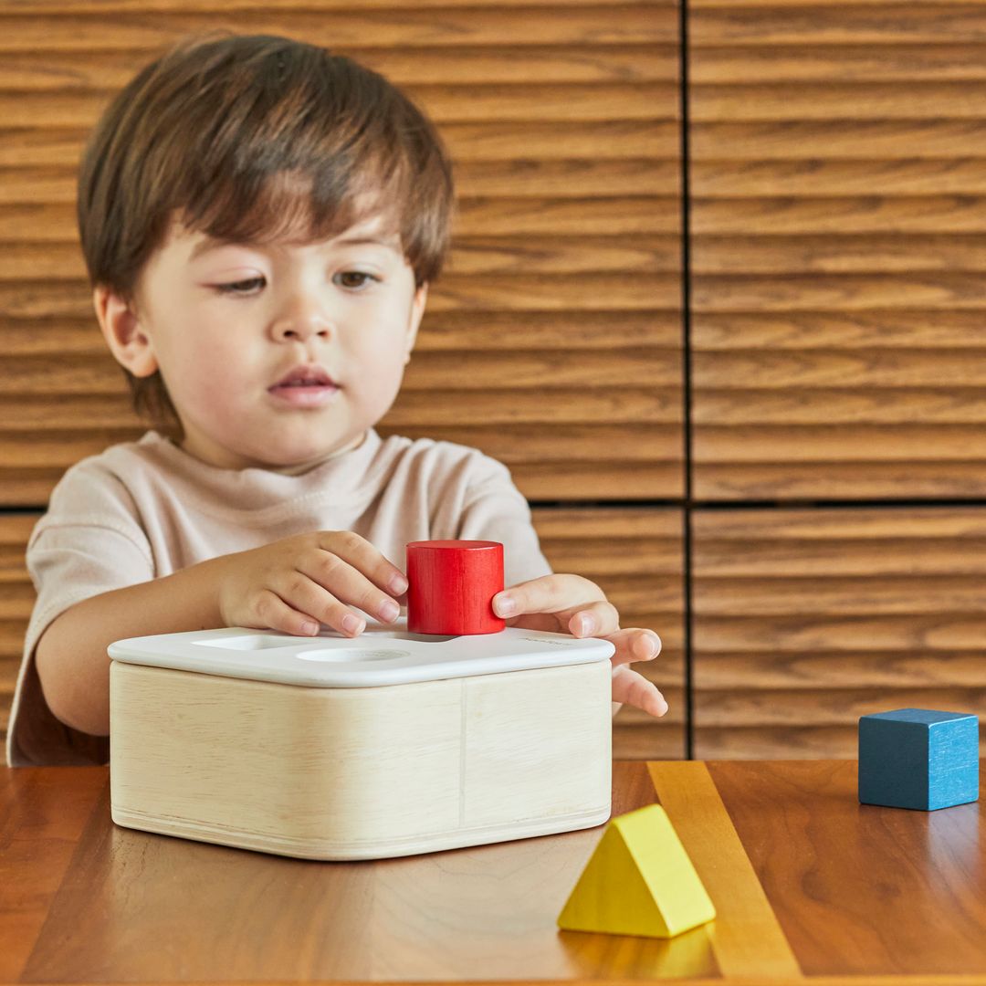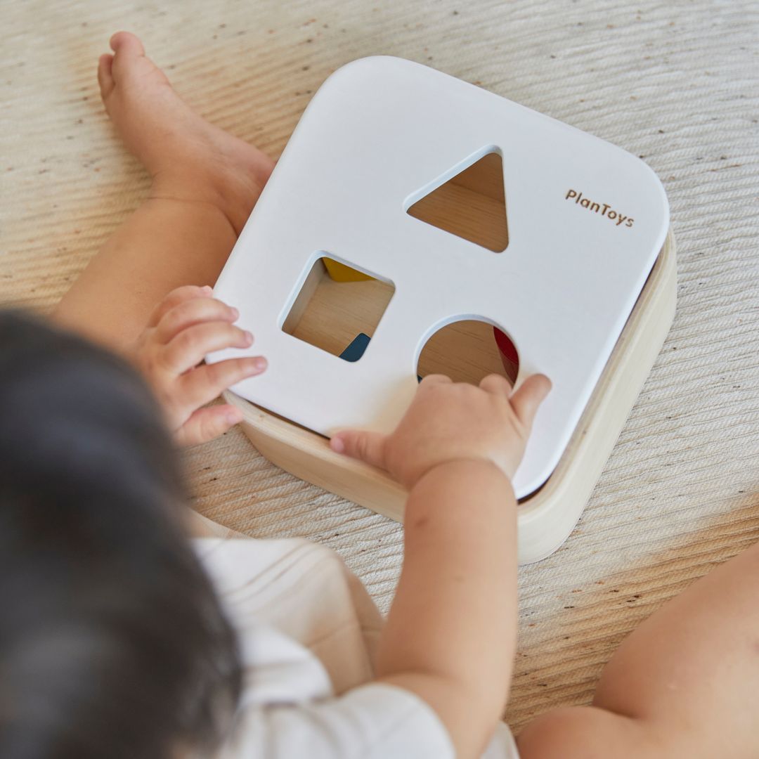 The PlanToys Shape & Sort It Out Bin encourages recognition of colors and shapes well as the development of hand-eye coordination.