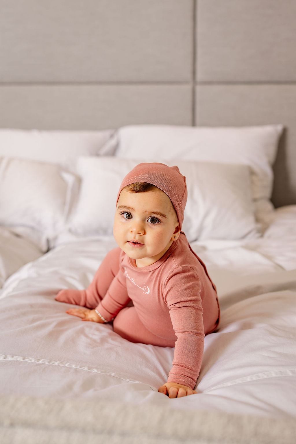 The Shoot for the Moon Footie in Candy Pink offers a perfect fit with just the right amount of stretch for all-day comfort. Its rich pink color pops with playful charm, and it comes with a matching hat to complete the look. Soft, cozy fabric makes this set ideal for little dreamers ready to explore!
